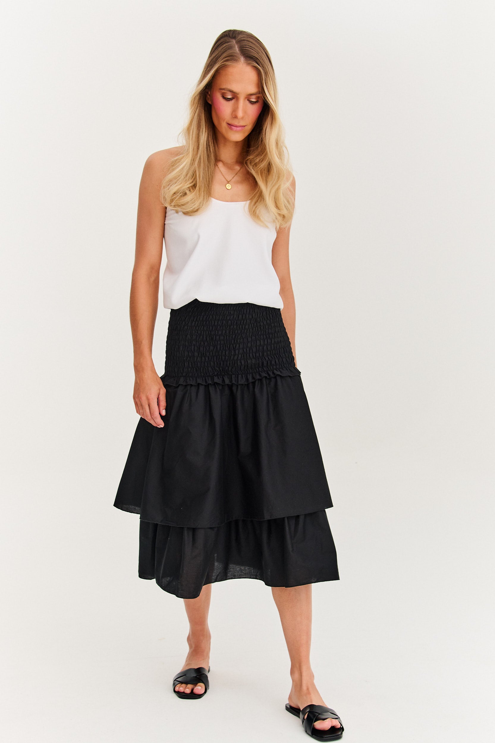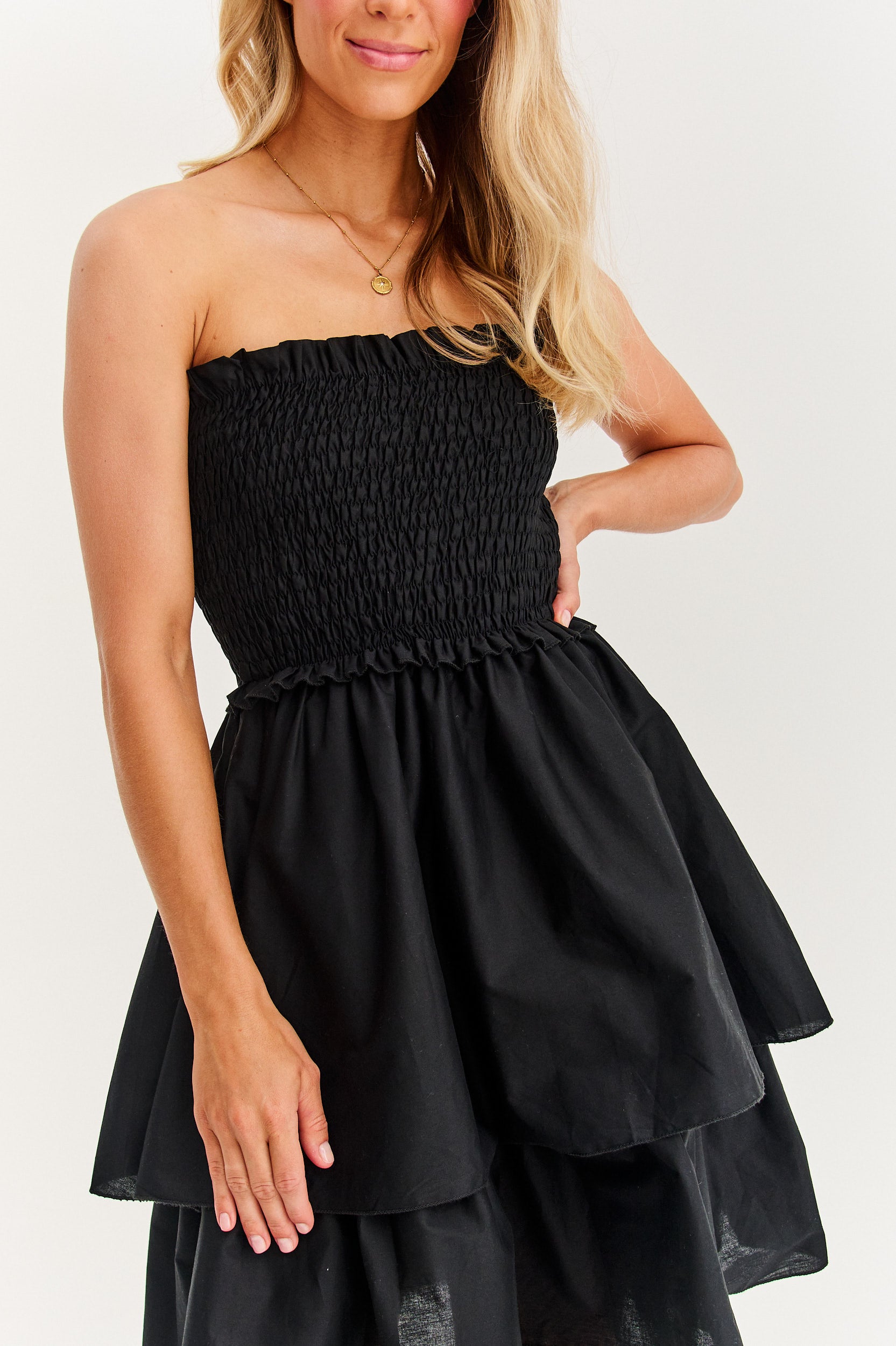 Sukienka mini Moon Moment to klasyczna mała czarna w letnim, bawełnianym wydaniu. Uszyta z przewiewnej tkaniny z delikatnym elastanem, pięknie dopasowuje się do sylwetki, a dzięki marszczonemu topowi i falbaniastej spódnicy – wygląda lekko i dziewczęco.