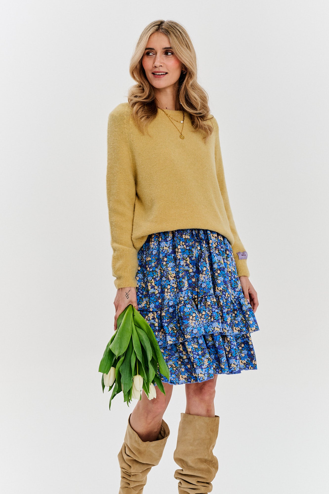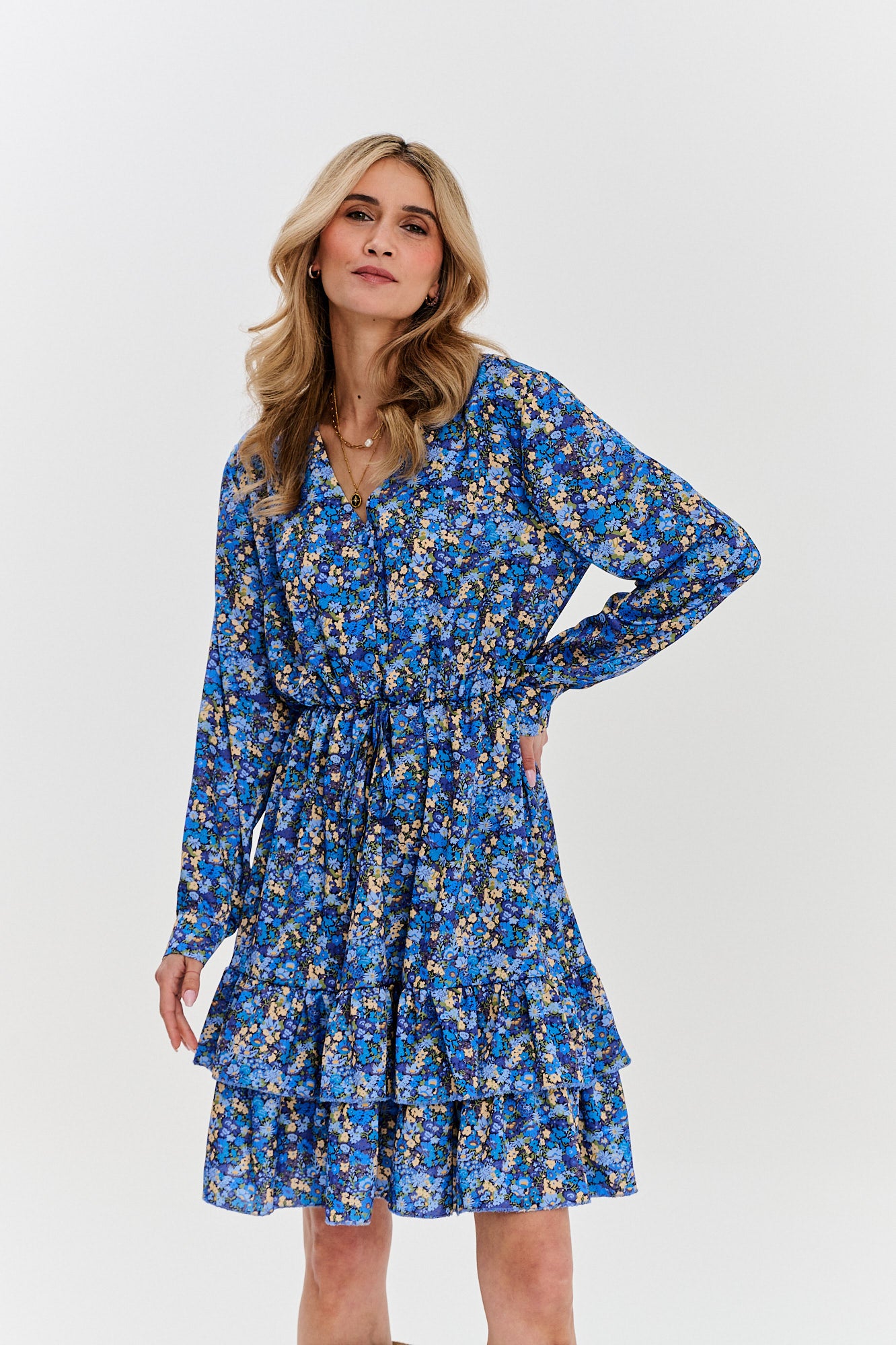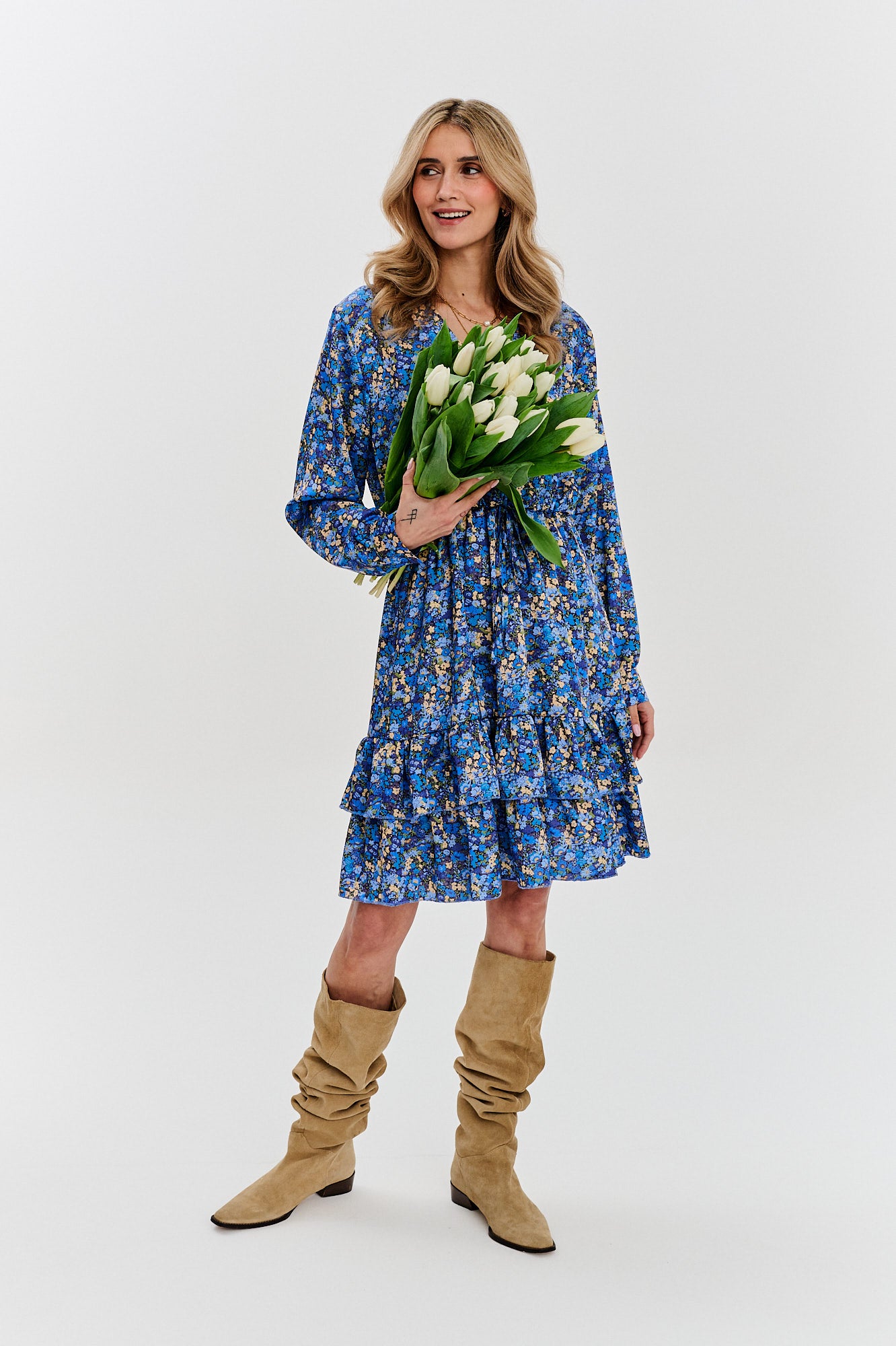 Sukienka mini Sunlit Sky to esencja romantycznego, kobiecego stylu z nutą lekkości i swobody. Delikatny, kwiatowy print w odcieniach niebieskiego dodaje świeżości, a zwiewny krój z falbanami podkreśla subtelny charakter stylizacji. Taliowany fason z wiązaniem pięknie modeluje sylwetkę, nadając jej lekkości i wdzięku.
