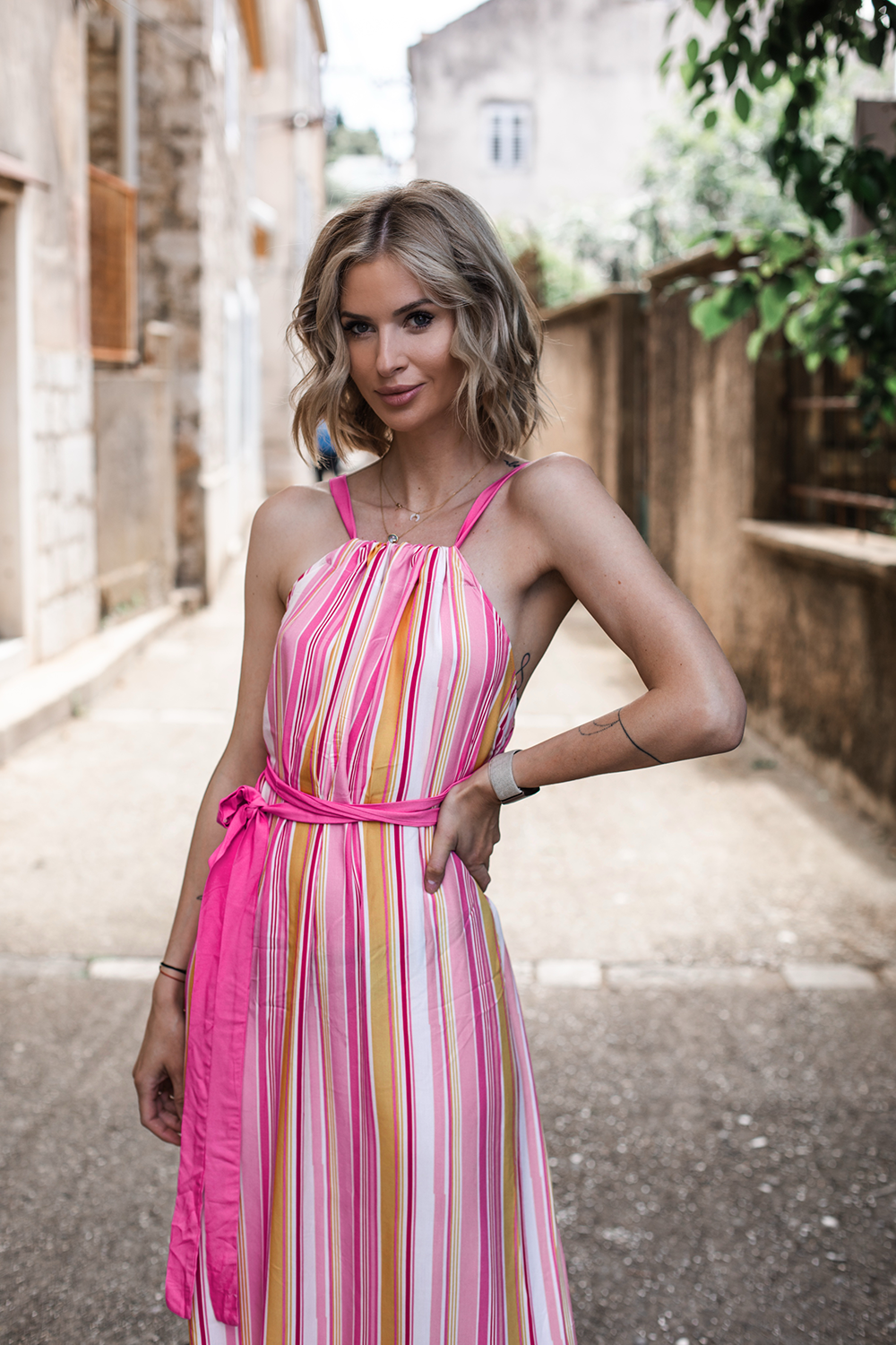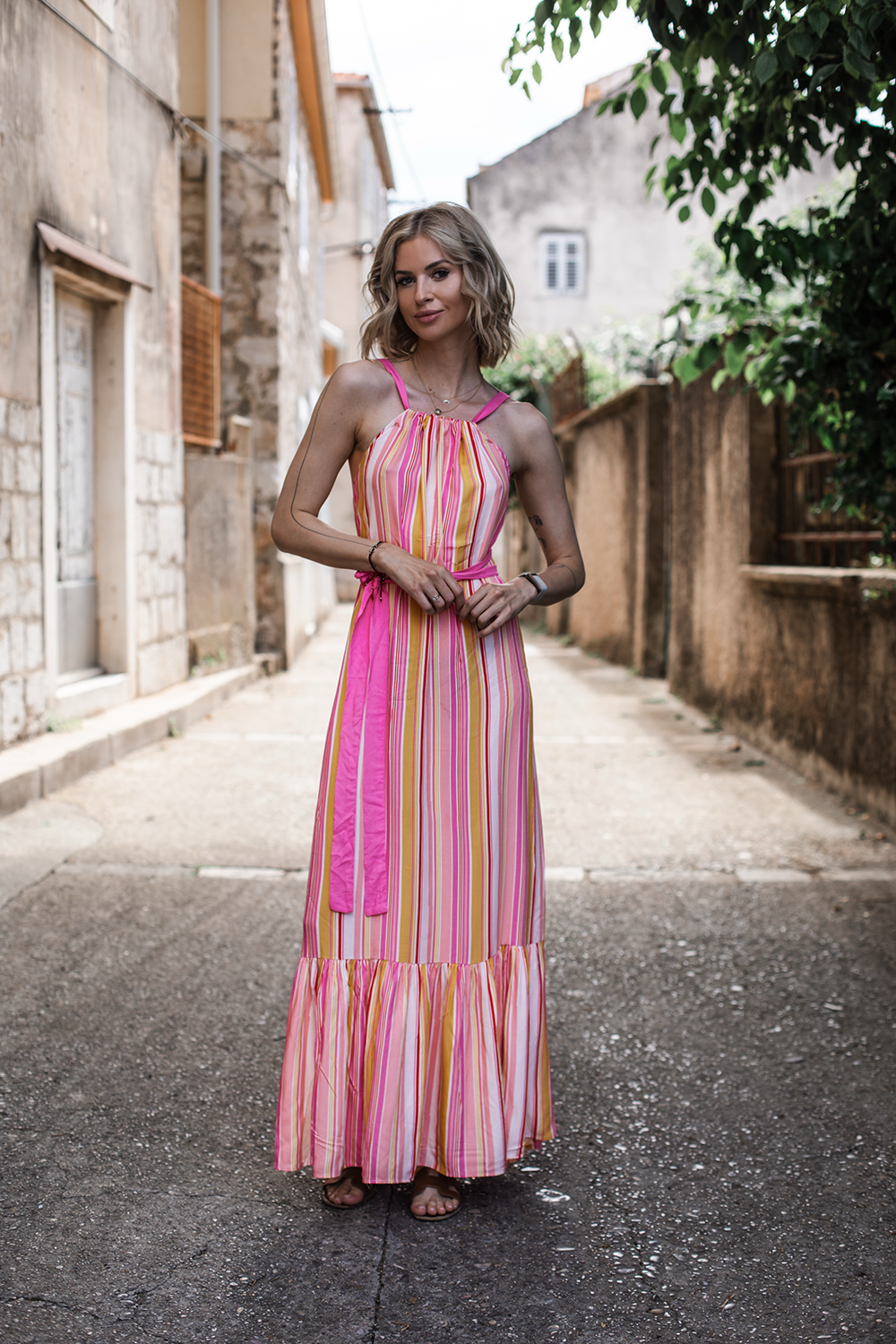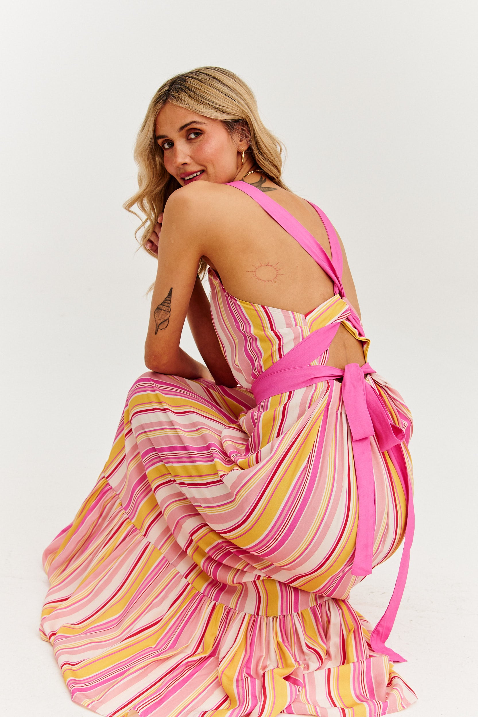 Sukienka multiway Candy Coastline to kwintesencja wakacyjnego luzu i kobiecego wdzięku. Różowo-żółte pasy przywołują wspomnienia najpiękniejszych zachodów słońca nad morzem, a delikatny połysk materiału i rozkloszowany dół z falbaną sprawiają, że każdy ruch wygląda w niej lekko i efektownie. To model typu multiway – możesz nosić ją na wiele sposobów, wiązać na szyi, na plecach lub klasycznie z kokardą w talii. Wybierz wersję, która najlepiej wyrazi Ciebie. Nie musisz wybierać między wygodą a wyjątkowością – Candy Coastline daje Ci jedno i drugie.