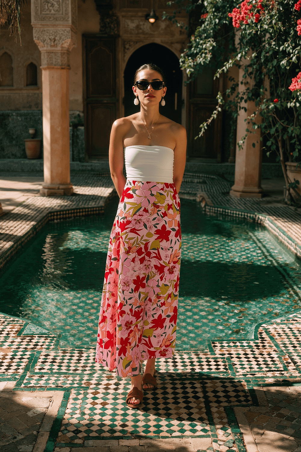Sukienka multiway Dream Island to Twoja przepustka do wakacyjnej wolności i kobiecości. Radosny, kwiatowy print na pudrowym tle przywodzi na myśl leniwe dni pod palmami i zachody słońca nad oceanem. Jej wiązane ramiączka dają Ci nieograniczone możliwości stylizacji – od plażowego looku po romantyczną kolację.