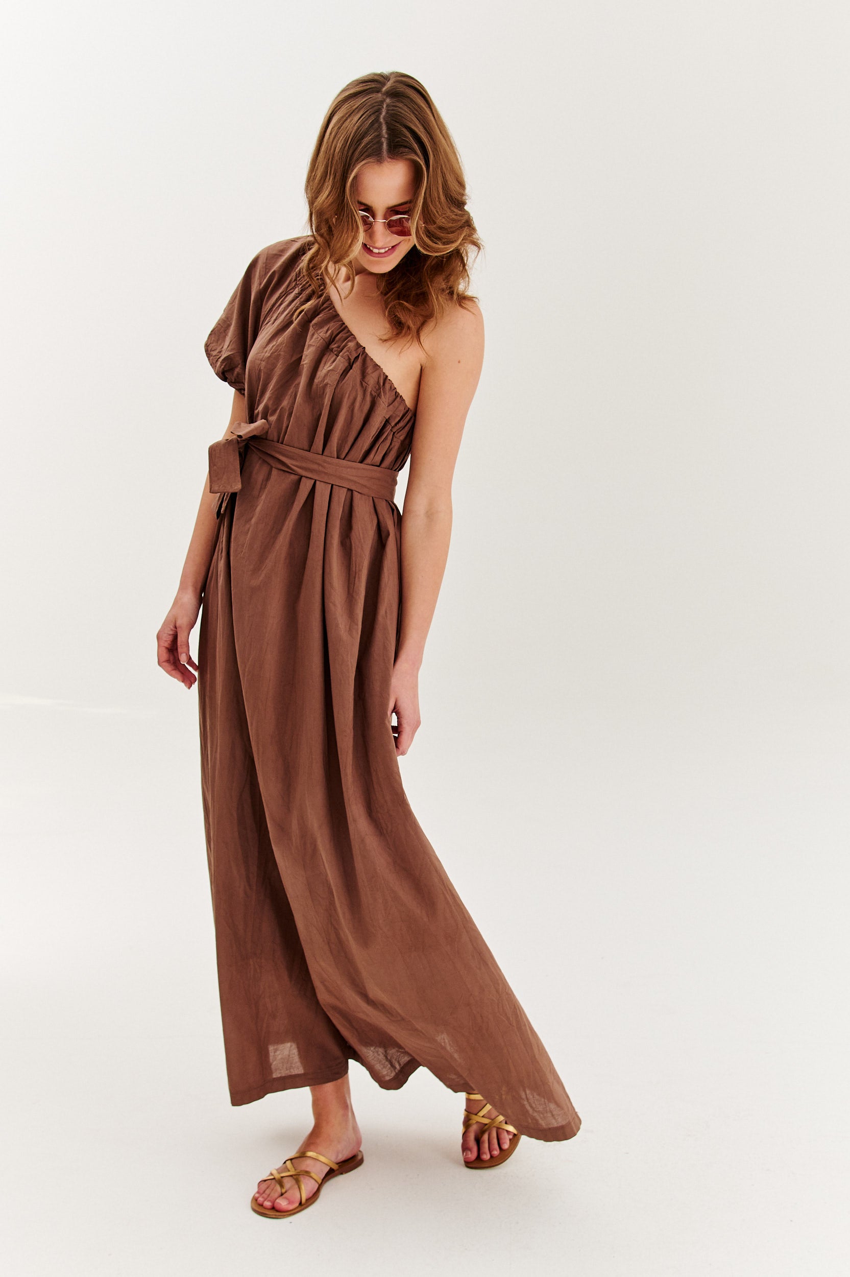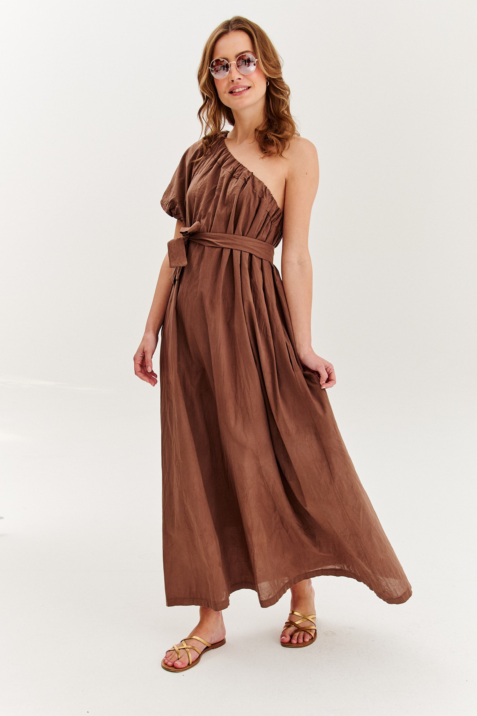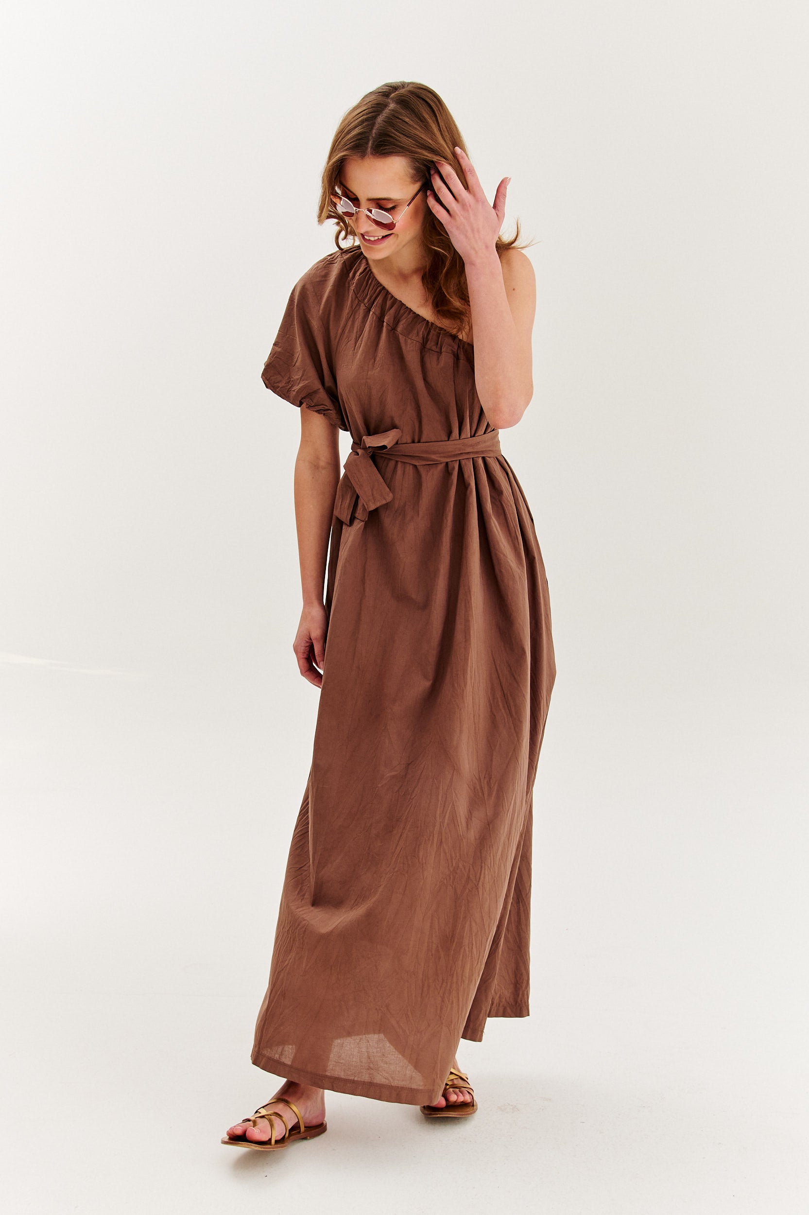Sukienka na jedno ramię Choco Mousse to propozycja dla kobiet, które cenią sobie połączenie naturalnych tkanin i wyrazistego charakteru. Wykonana w 100% z bawełny, zachwyca głębokim, kakaowym odcieniem mocha i asymetrycznym krojem, który pięknie eksponuje ramiona.