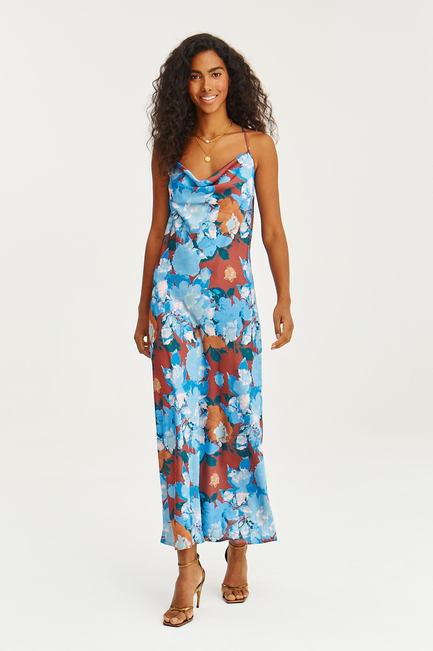 Sukienka na ramiączkach Painted Memories to kwiatowa sukienka maxi, która zachwyca kolorem i kobiecą lekkością. Głębokie błękity przełamane ciepłymi akcentami tworzą artystyczny, malarski print, który trudno przeoczyć. Delikatny dekolt typu woda i cienkie ramiączka dodają romantyzmu i wakacyjnego luzu, a satynowa tkanina miękko układa się na sylwetce.