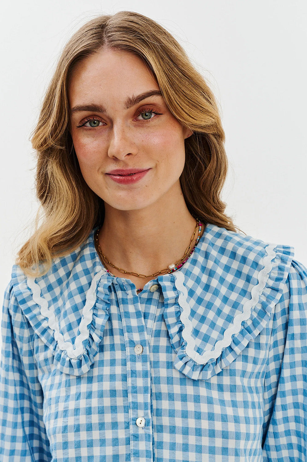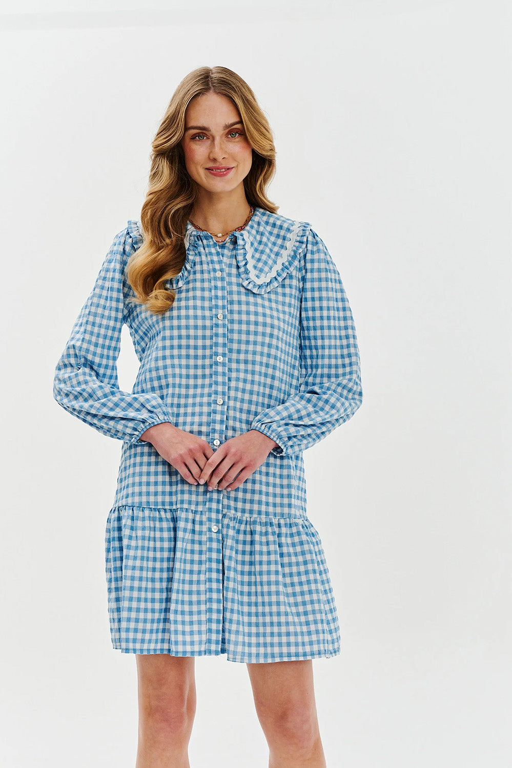 Sukienka Sweet Storm to idealne połączenie nostalgii i nowoczesności. Klasyczny krój baby doll z rozkloszowanym dołem i delikatną kratką w odcieniu pastelowego błękitu tworzy bazę, która zachwyca subtelnością. Uwagę przyciąga dekoracyjny kołnierzyk z falbanką i białą tasiemką – to detal, który podbija serca i dodaje całości romantycznego charakteru.