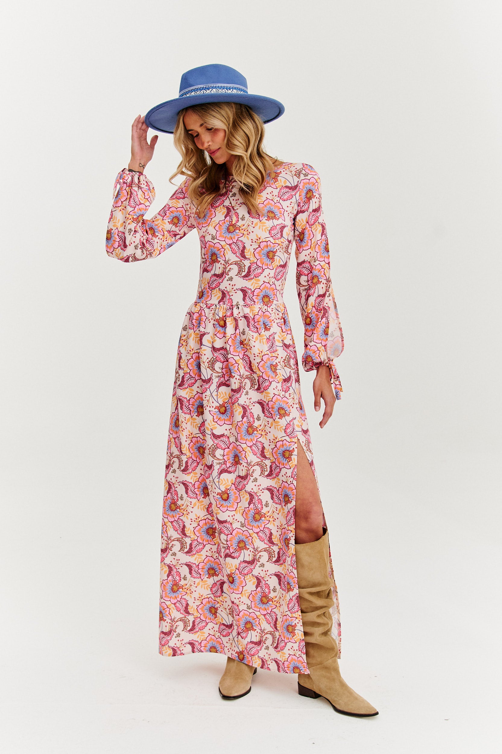 Wyobraź sobie letni poranek, ciepły wiatr i Ty – otulona kwiatowym printem, który wygląda jak wyjęty z najpiękniejszych snów. Sukienka z pękniętym rękawem maxi Dreamfield to propozycja, która hipnotyzuje romantycznym wzorem, zwiewnością i detalami, które robią różnicę – pęknięte rękawy z wiązaniem i zmysłowe rozcięcie na nodze.