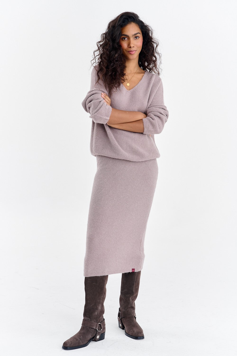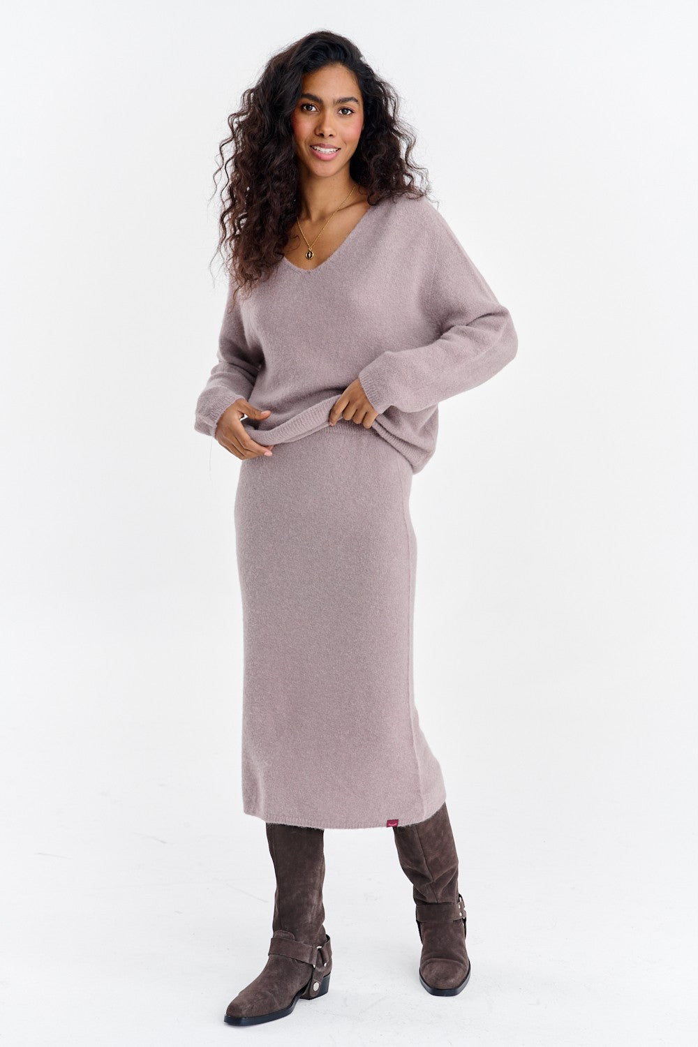 Głęboki dekolt w serek pięknie eksponuje szyję i obojczyki, idealnie nadając się do noszenia solo lub w połączeniu z ulubioną koszulą. Szerokie ściągacze na rękawach i na dole swetra utrzymują jego formę. Stwórz idealny dzianinowy komplet, łącząc go z pasującą spódnicą.