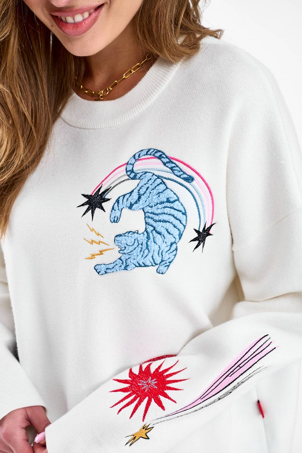 Sweter Have Fun to projekt dla tych, którzy nie biorą życia zbyt serio. Jasna baza stała się płótnem dla eklektycznego zbioru naszywek i grafik. Znajdziesz tu skaczącego tygrysa, magiczne grzyby, serce z okiem i inspirujące hasła. To sweter, który opowiada historię pełną przygód.