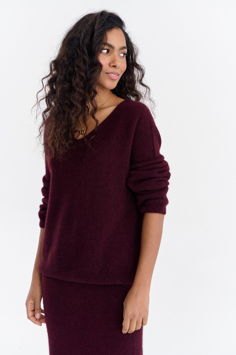 Sweter Magnetic Instinct to esencja jesiennej elegancji. Wykonany z niezwykle miękkiej, przyjemnej dla skóry dzianiny w głębokim, szlachetnym odcieniu bordo. Swobodny krój oversize z lekko opuszczonymi ramionami to gwarancja wygody i stylowego luzu.
