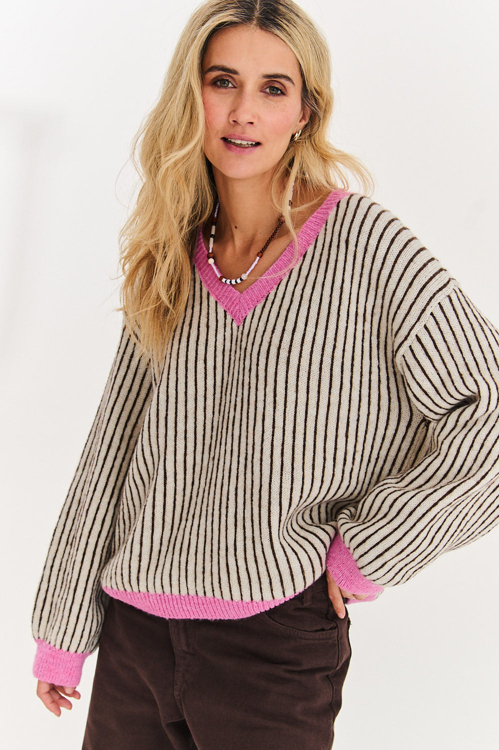 Sweter Pillow Talk to kwintesencja komfortu z modowym twistem. Ten model o swobodnym kroju zachwyca klasycznym wzorem w drobne, kontrastowe paski. Cały jego charakter budują jednak detale – nasycone, różowe ściągacze.