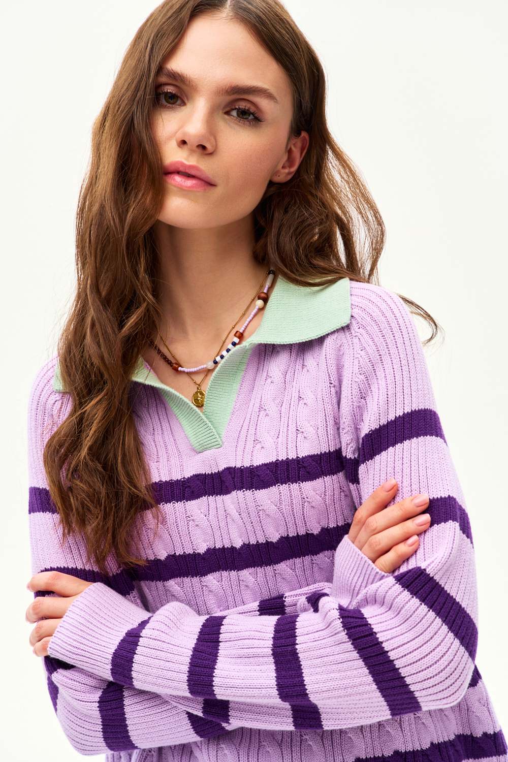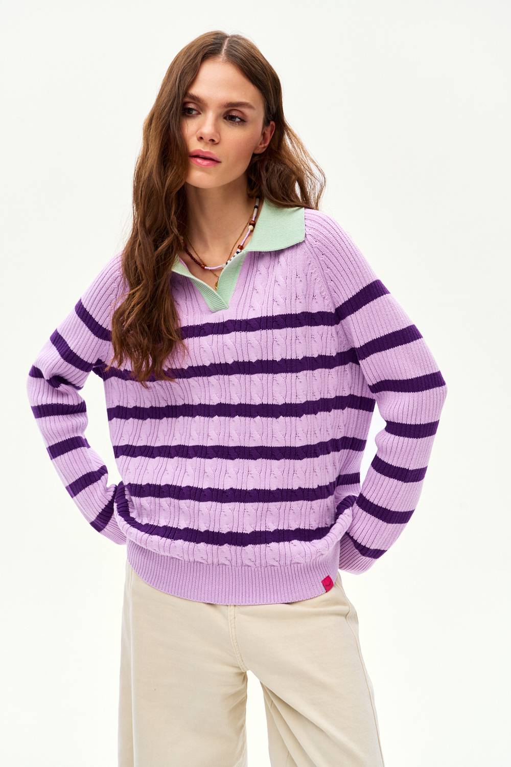 Sweter polo Dreamy State to propozycja pełna harmonii i delikatności. Lawendowe pasy w połączeniu z jaśniejszym tłem i miętowym wykończeniem dekoltu tworzą kojącą paletę barw. Warkoczowy wzór dzianiny podkreśla wysoką jakość wykonania.