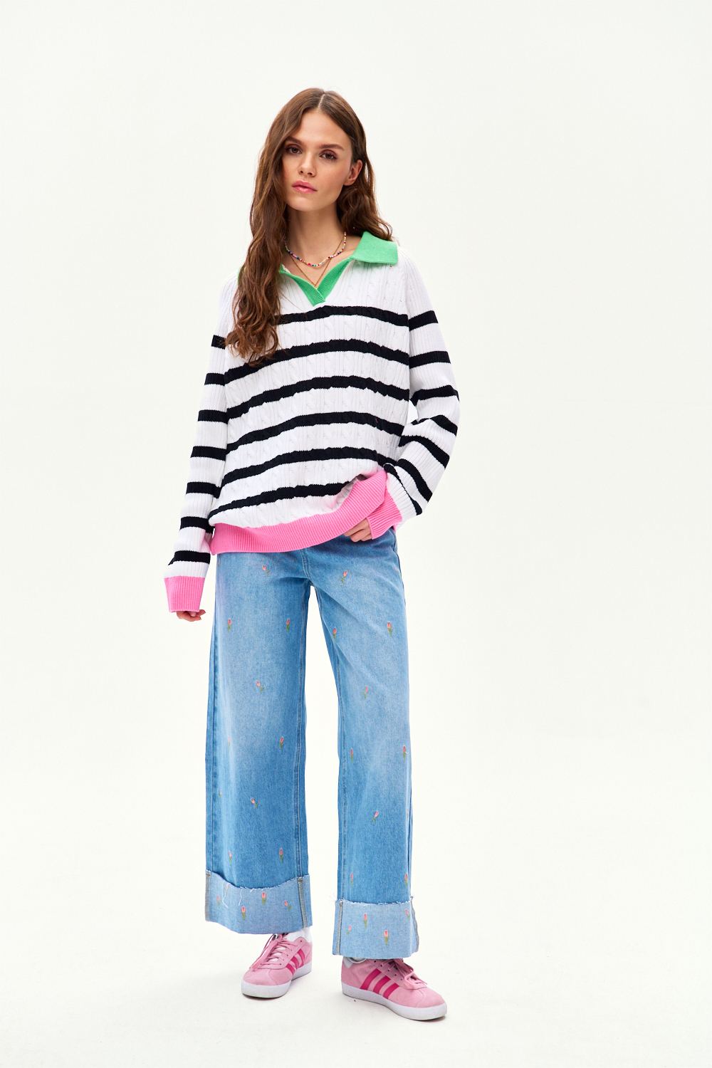 Sweter polo Fresh Start łączy w sobie elegancję kołnierzyka z luźnym stylem marynarskich pasów. Kontrastujący zielony kołnierzyk i różowe ściągacze to detale w stylu „color blocking", które wyróżniają ten model na tle zwykłych swetrów. Warkoczowy splot dodaje mu szlachetności.