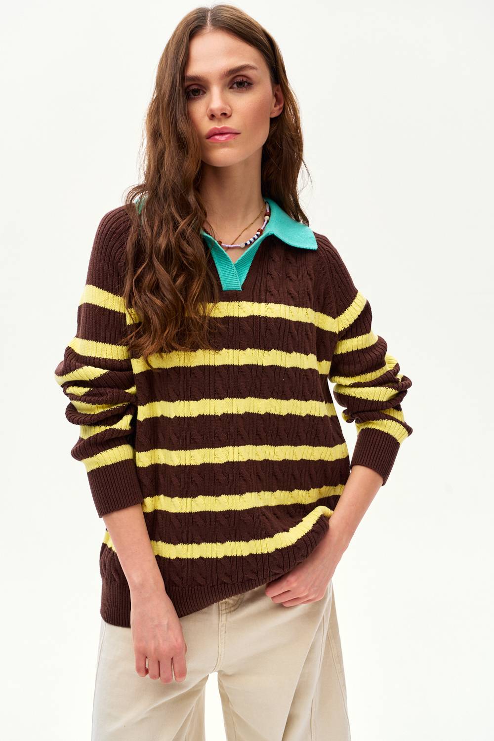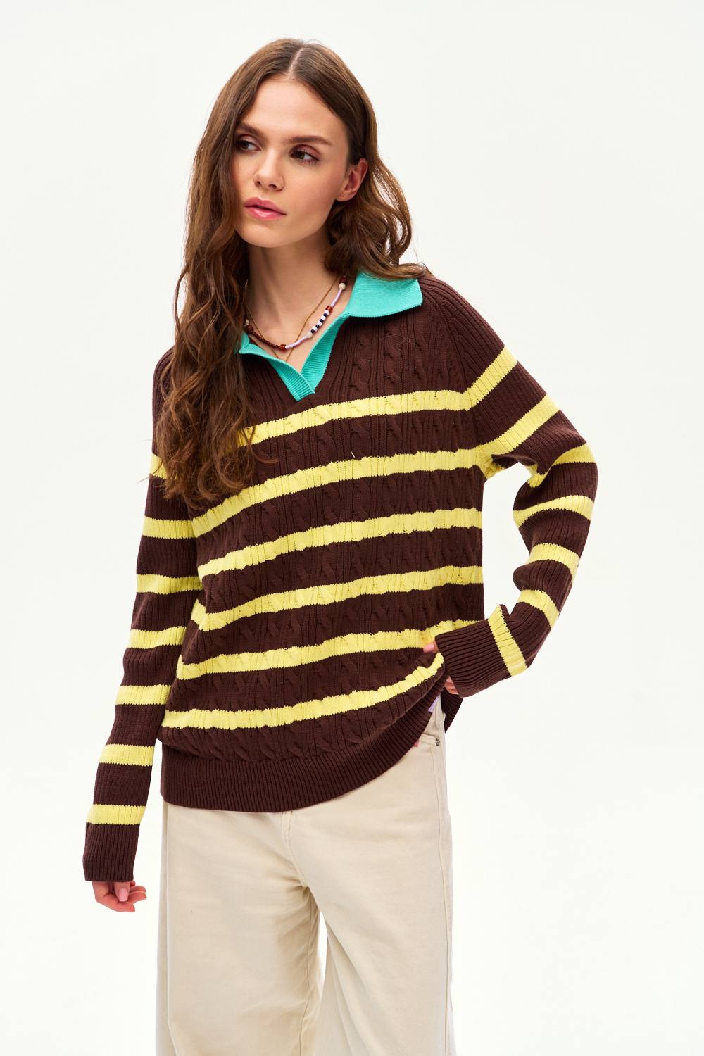 Sweter polo Lucky Mood to stylowy powrót do estetyki lat 70. Nasycony brąz bazy świetnie kontrastuje z jasnymi pasami, a turkusowy akcent przy szyi dodaje całości pazura. Tradycyjny splot warkoczowy nadaje mu fakturę, którą chce się nosić non stop.