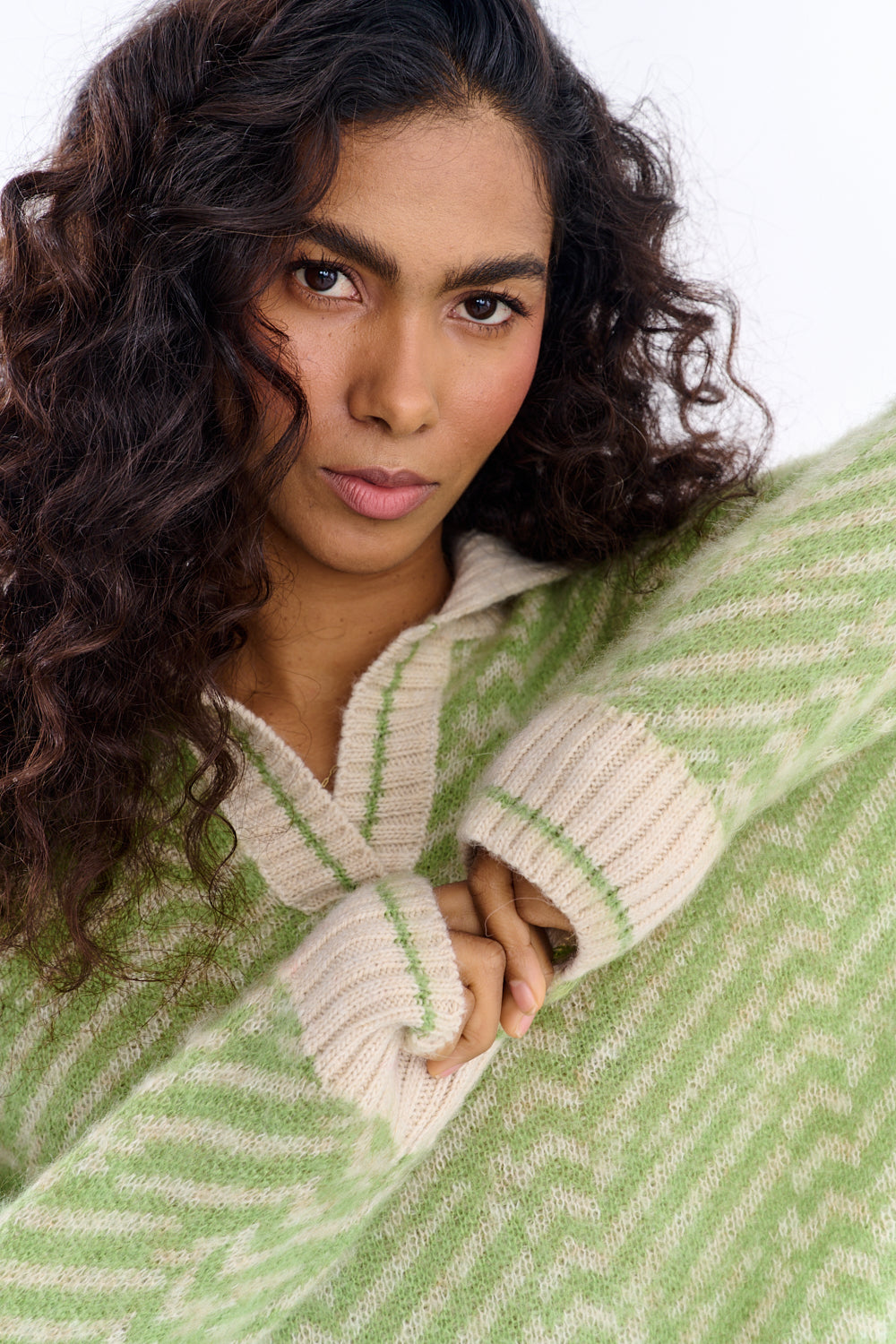 Sweter polo z moherem Almost Silence to kwintesencja stylu "preppy". Zainspirowany akademickim stylem, łączy w sobie sportową elegancję z odrobiną nostalgii. Spokojna zieleń w subtelny wzór jodełki tworzy piękne tło dla białego kołnierzyka i mankietów.