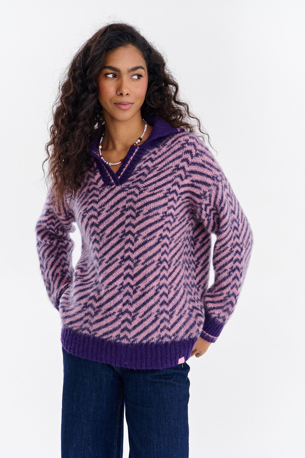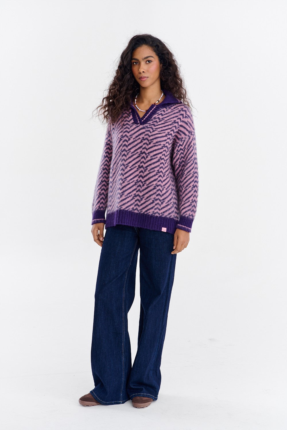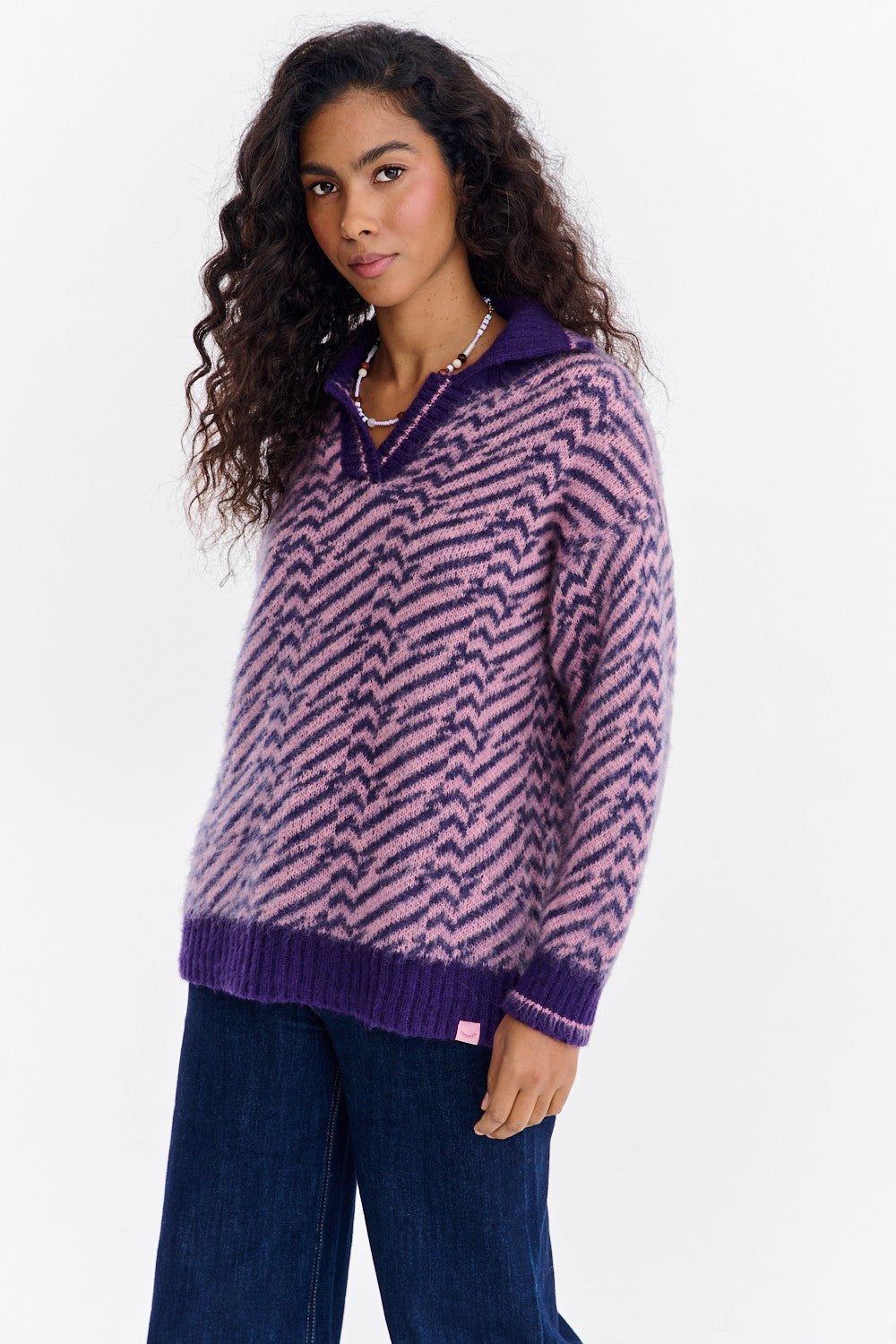Dzięki domieszce moheru, sweter jest niezwykle przyjemny dla skóry i ciepły. Luźny krój z dekoltem V i kołnierzykiem polo to klasyka w stylu preppy, która świetnie przełamie codzienne stylizacje. Noś go do jeansów, by dodać im koloru, lub stwórz total look z innymi odcieniami różu i fioletu.