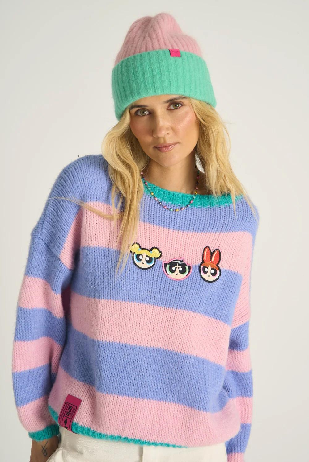 Sweter Powerpuff Girls to nostalgiczny powrót do lat 90. w najlepszym stylu. Oversizowy krój i szerokie pasy w odcieniach lawendy i różu tworzą radosną, energetyczną całość. Turkusowe ściągacze stanowią ciekawy kontrast.