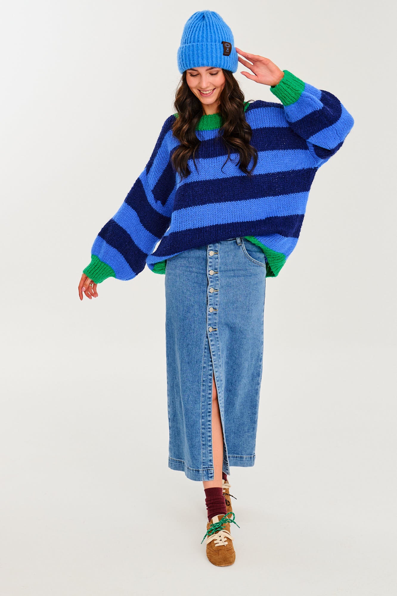 Sweter Raindrop Reflection to wyjątkowy model inspirowany ponadczasowymi wyborami. Jego wyraziste, niebieskie pasy nawiązują idealnie współgrają z kontrastującymi, zielonymi ściągaczami przy dekolcie, mankietach i dolnej części dodają całości energii i świeżości, przywołując na myśl bujną zieleń po deszczu.