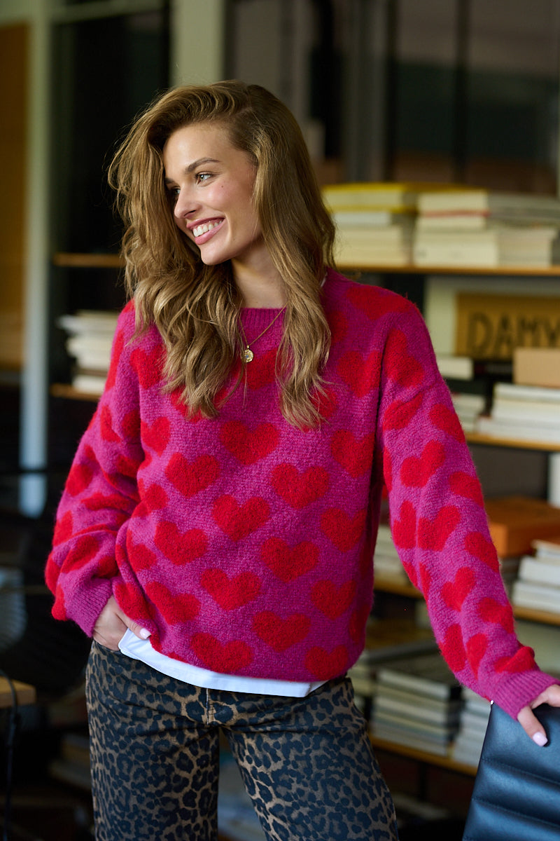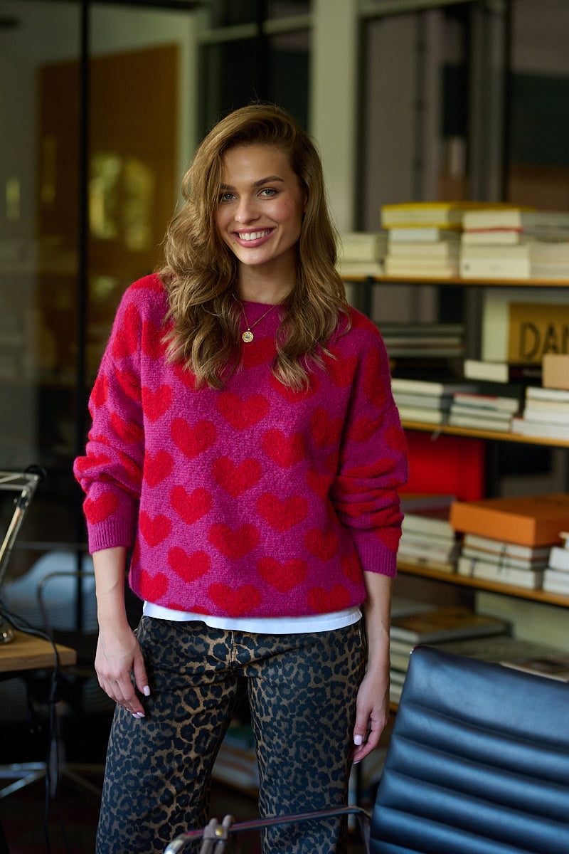 Sweter Softly Yours to uosobienie romantycznej energii i radości codziennych chwil. Utrzymany w intensywnym, fuksjowym odcieniu z wyrazistym motywem czerwonych serc, przyciąga spojrzenia i wnosi odrobinę beztroskiej miłości do każdej stylizacji.