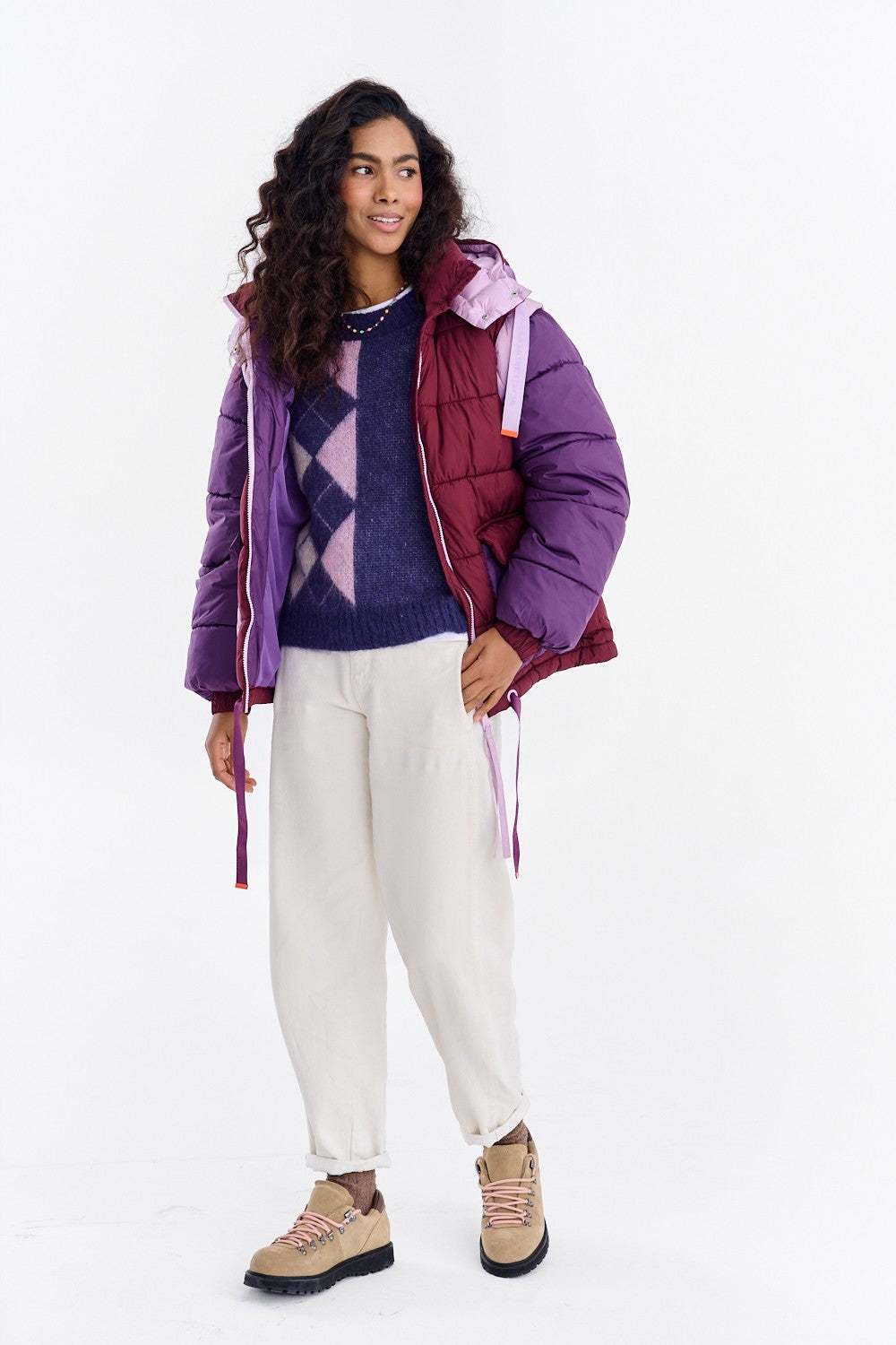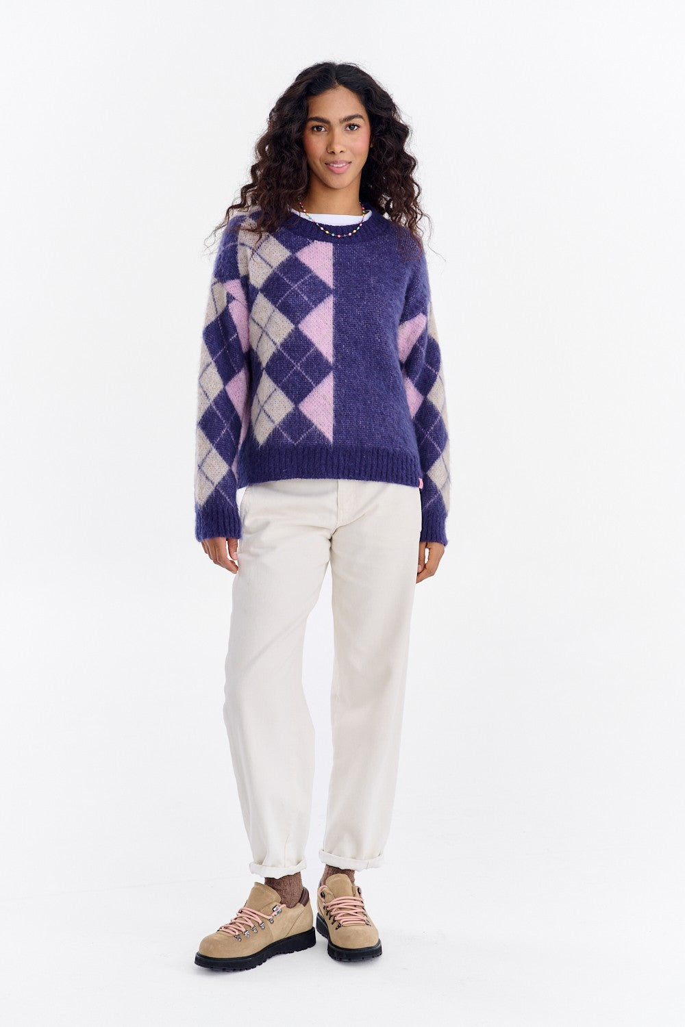 Sweter z moherem Quiet Story to klasyka w interesującym wydaniu. Cechuje go odważne połączenie kontrastowych kolorów: głęboki fiolet, intensywny róż i klasyczny beż tworzą wyrazistą, geometryczną kompozycję.