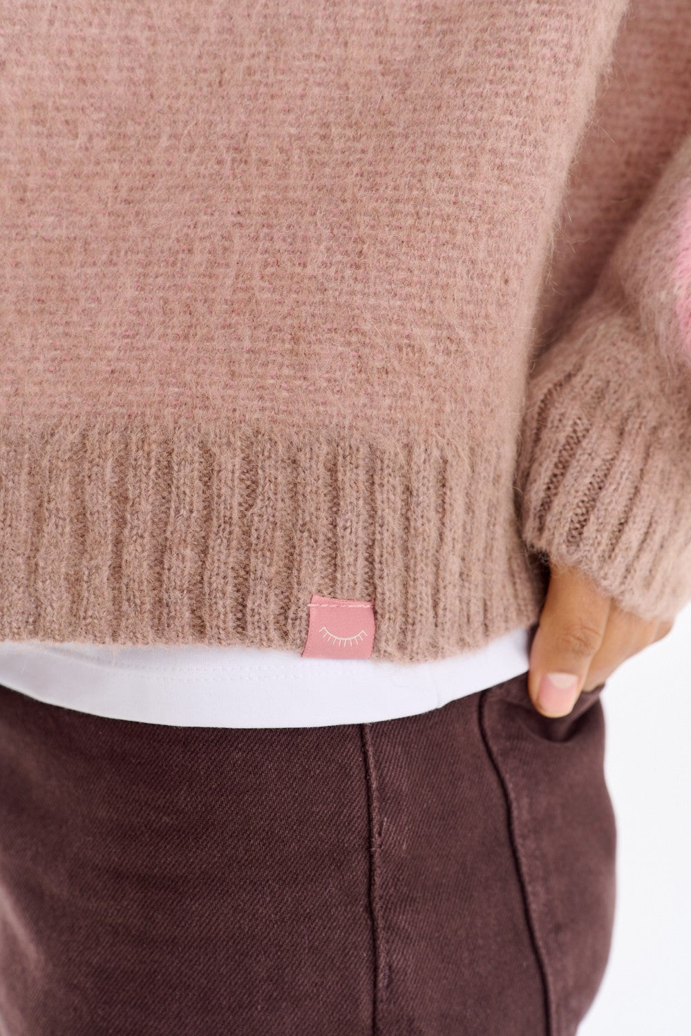 Sweter z moherem Softspoken to idealny towarzysz dla każdej miłośniczki stylu "dark academia". Zachwyca klasycznym wzorem w romby w stonowanej, brązowo-różowej kolorystyce. Asymetryczny układ wzoru na przodzie nadaje mu nowoczesnego charakteru.