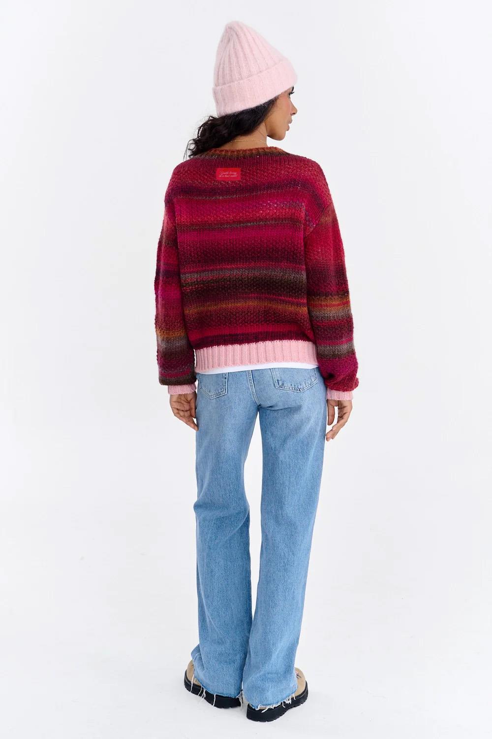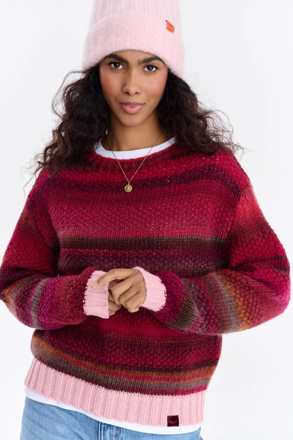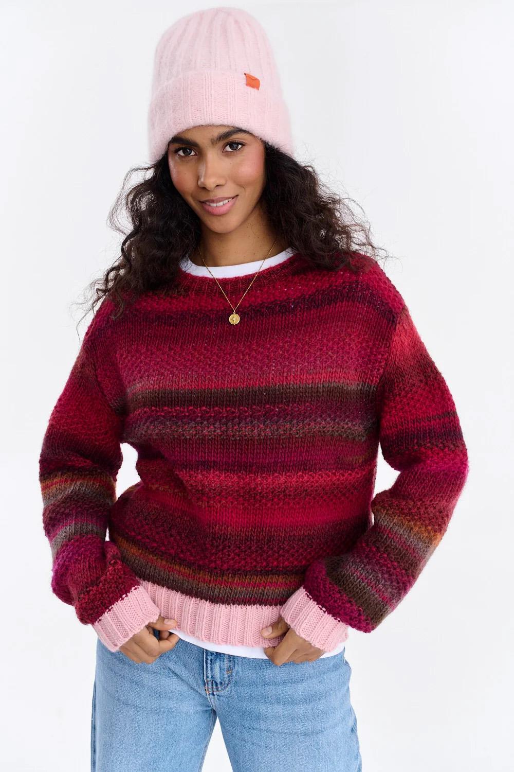 Sweter Burning Bloom to kolejna odsłona naszego bestsellerowego swetra w pasy. Ta wersja skupia się na głębokich, nasyconych kolorach jesieni – dominują tu różne odcienie bordo, czerwieni i ciemnej zieleni, tworząc melanżowy wzór.