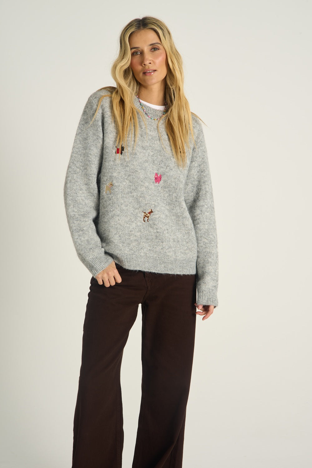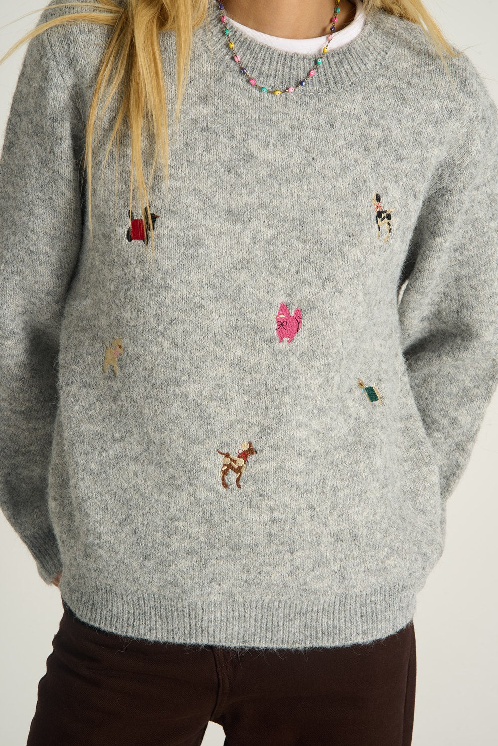 Sweter z wełną Cozy Tails to definicja jesiennej przytulności z dużą dawką humoru. Klasyczna, melanżowa szarość stała się tu tłem dla najsłodszej "psiarni" w Twojej szafie. Kolorowe, haftowane sylwetki czworonogów – od jamnika po pudelka – sprawiają, że ten model to absolutny must-have dla każdej miłośniczki psów.