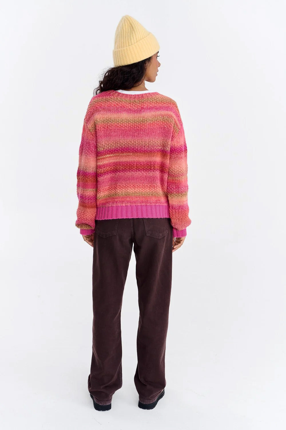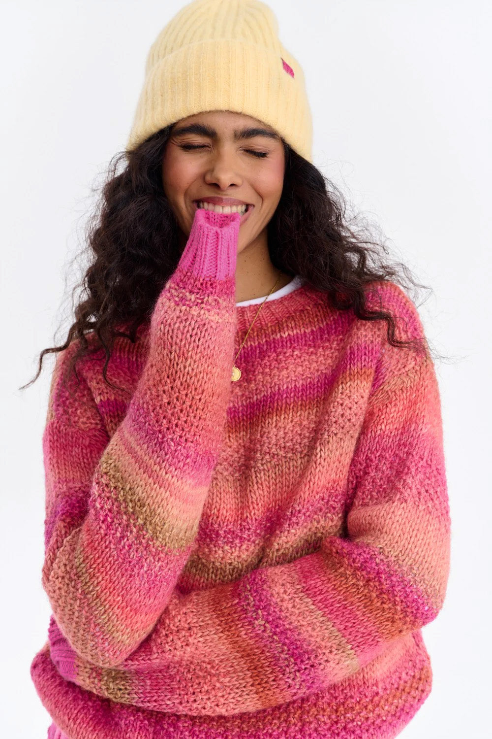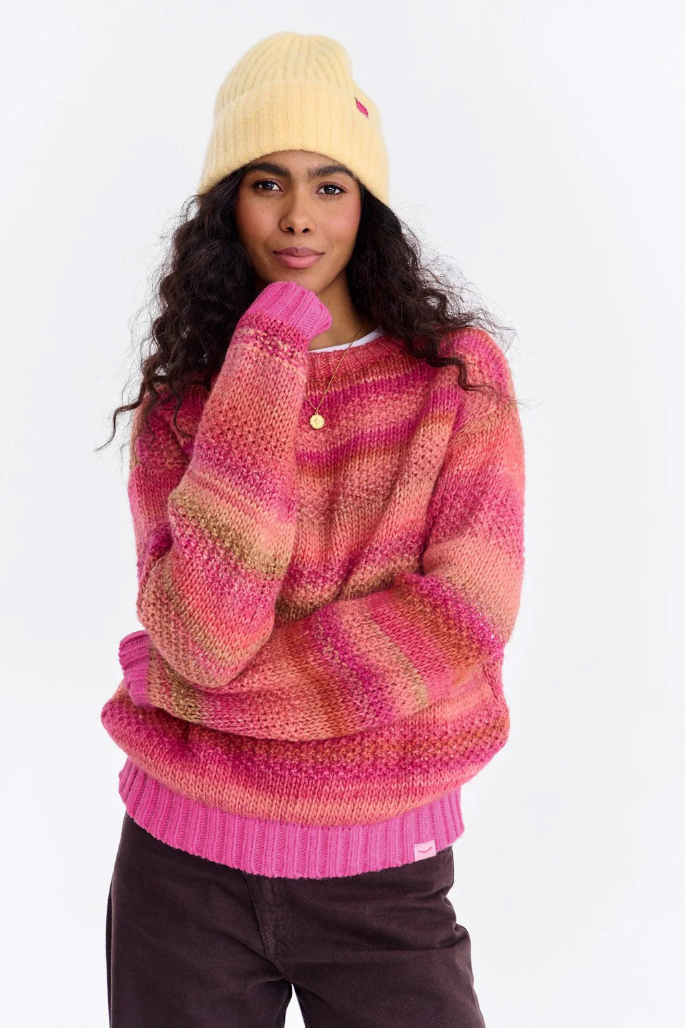 Sweter Desert Whisper to idealny towarzysz na jesienne chłody. Jego paleta barw, inspirowana kolorami ziemi, łączy w sobie różne odcienie brązu, beżu i pomarańczu, tworząc harmonijne pasy. Niespodziewanym akcentem jest wykończenie rękawów i dołu swetra w kolorze intensywnego różu.