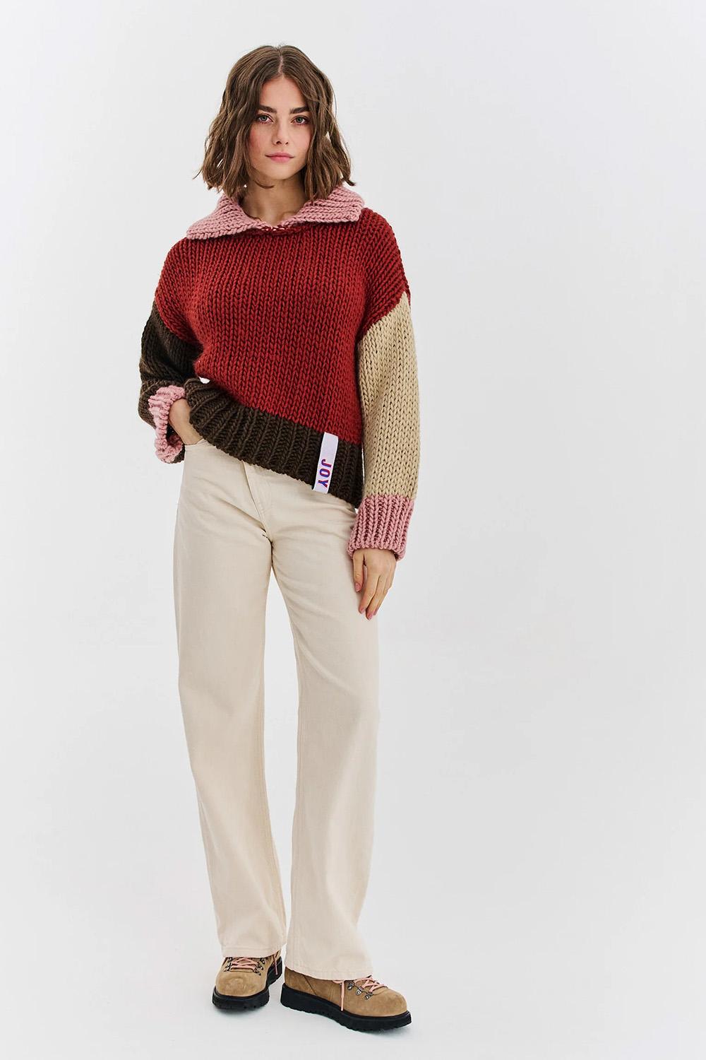 Sweter Smile Collector z dodatkiem wełny to urocze połączenie stylu retro z nowoczesnymi trendami. Jego design opiera się na technice color block, łącząc głęboki burgund, ciepły brąz, neutralny beż i słodki róż. Wyraźny, prążkowany kołnierzyk w stylu polo to najmodniejszy detal sezonu.