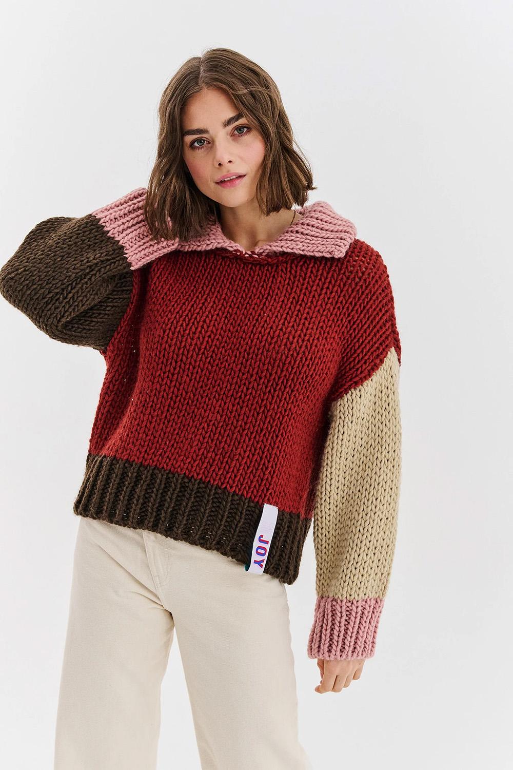 Sweter Smile Collector z dodatkiem wełny to urocze połączenie stylu retro z nowoczesnymi trendami. Jego design opiera się na technice color block, łącząc głęboki burgund, ciepły brąz, neutralny beż i słodki róż. Wyraźny, prążkowany kołnierzyk w stylu polo to najmodniejszy detal sezonu.