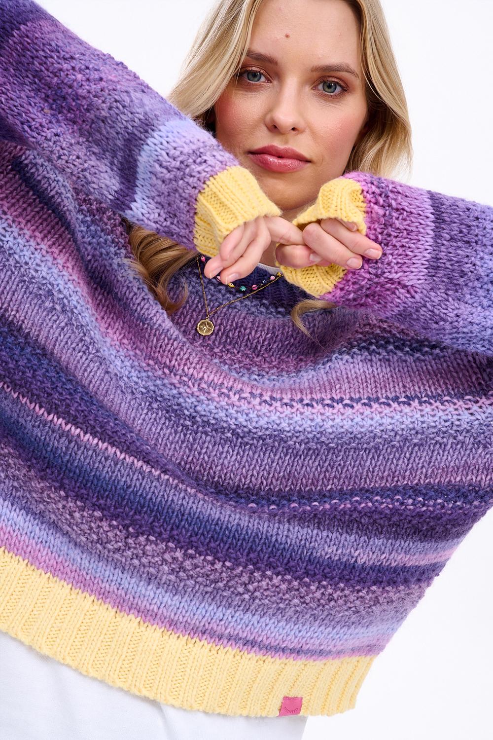Sweter Sweet Berry zachwyca harmonijnym połączeniem chłodnych odcieni fioletu i błękitu. Jego luźny krój z szerokimi rękawami zapewnia pełną swobodę ruchów. Wyraziste, żółte ściągacze na mankietach i u dołu swetra stanowią oryginalny akcent kolorystyczny.