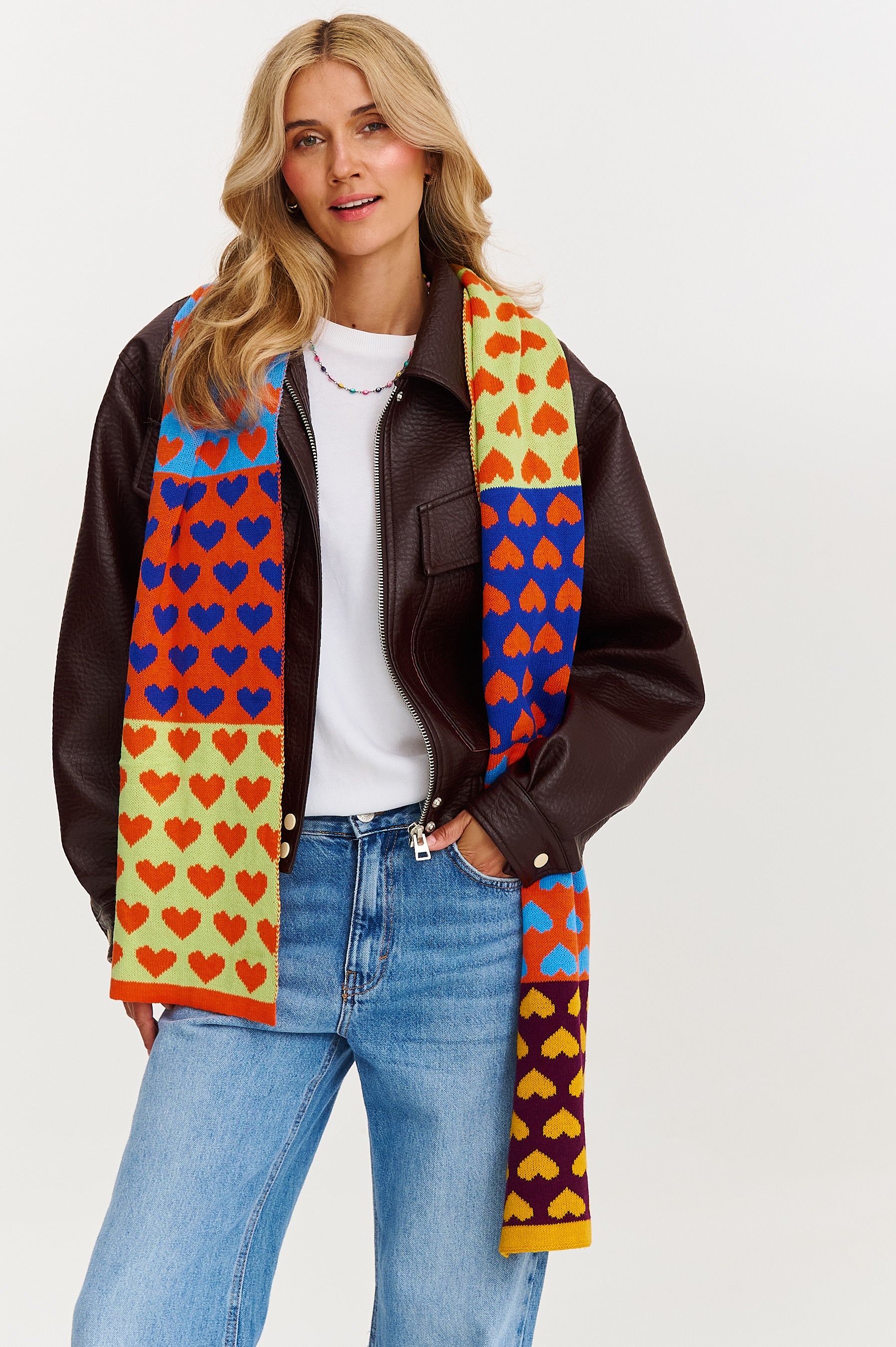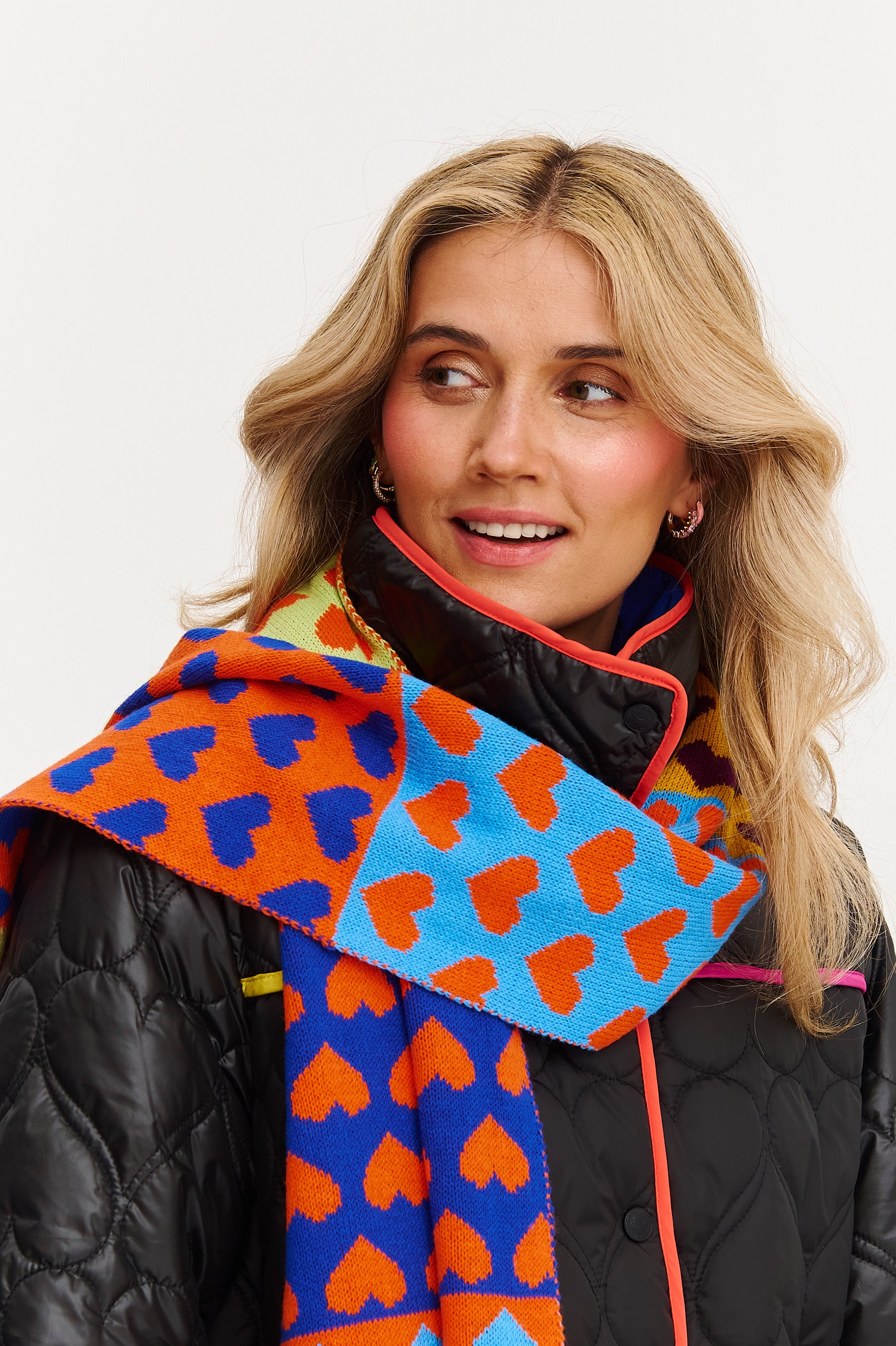 Szalik Downtown Hearts to kolorowy akcent, który rozgrzeje nie tylko w chłodne dni, ale także całą stylizację. Wyrazisty wzór serc w kontrastowych barwach sprawia, że dodatek staje się odważnym manifestem energii i optymizmu.
