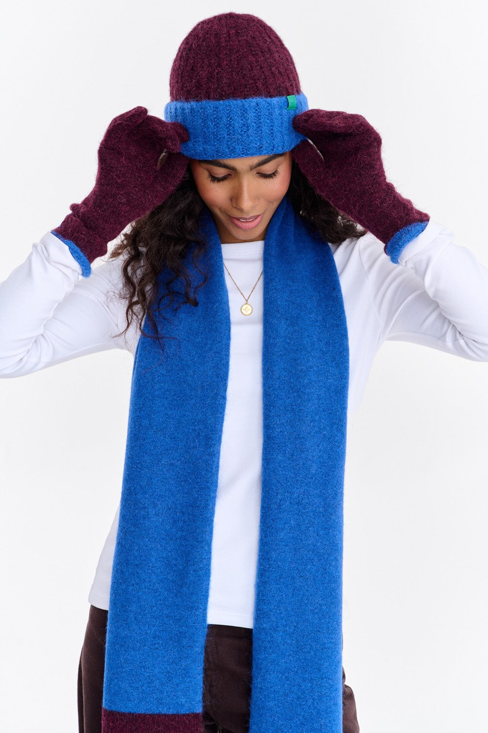 Szalik DuoPuff Plum Ocean to dodatek, który doda charakteru Twoim zimowym zestawom. Wzór gra kontrastem mocnych barw. Dominujący, głęboki błękit został przełamany na końcach szerokim, prążkowanym pasem w odcieniu śliwkowym.