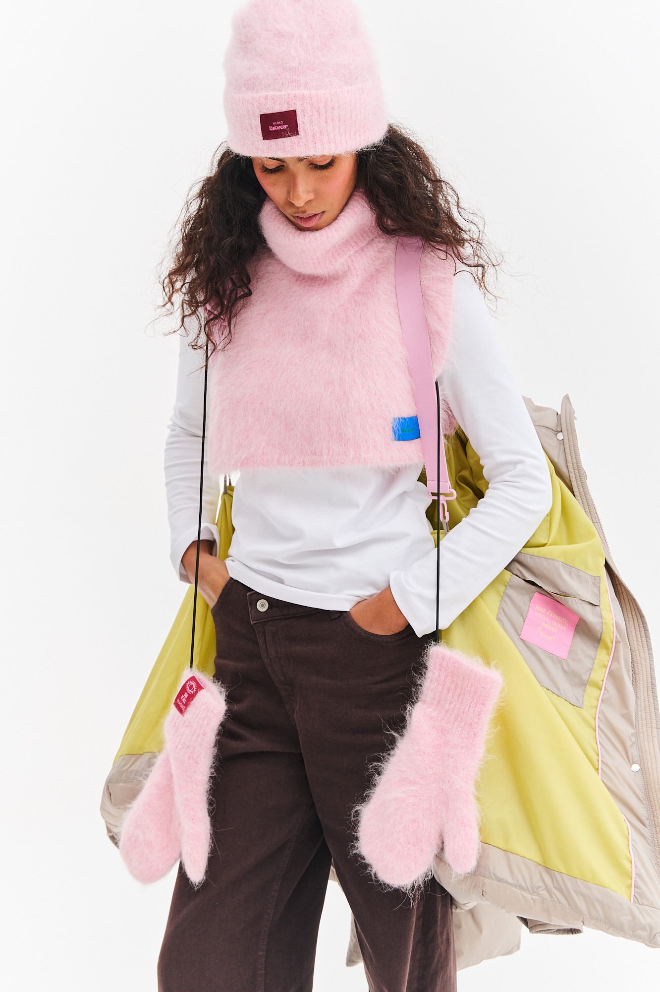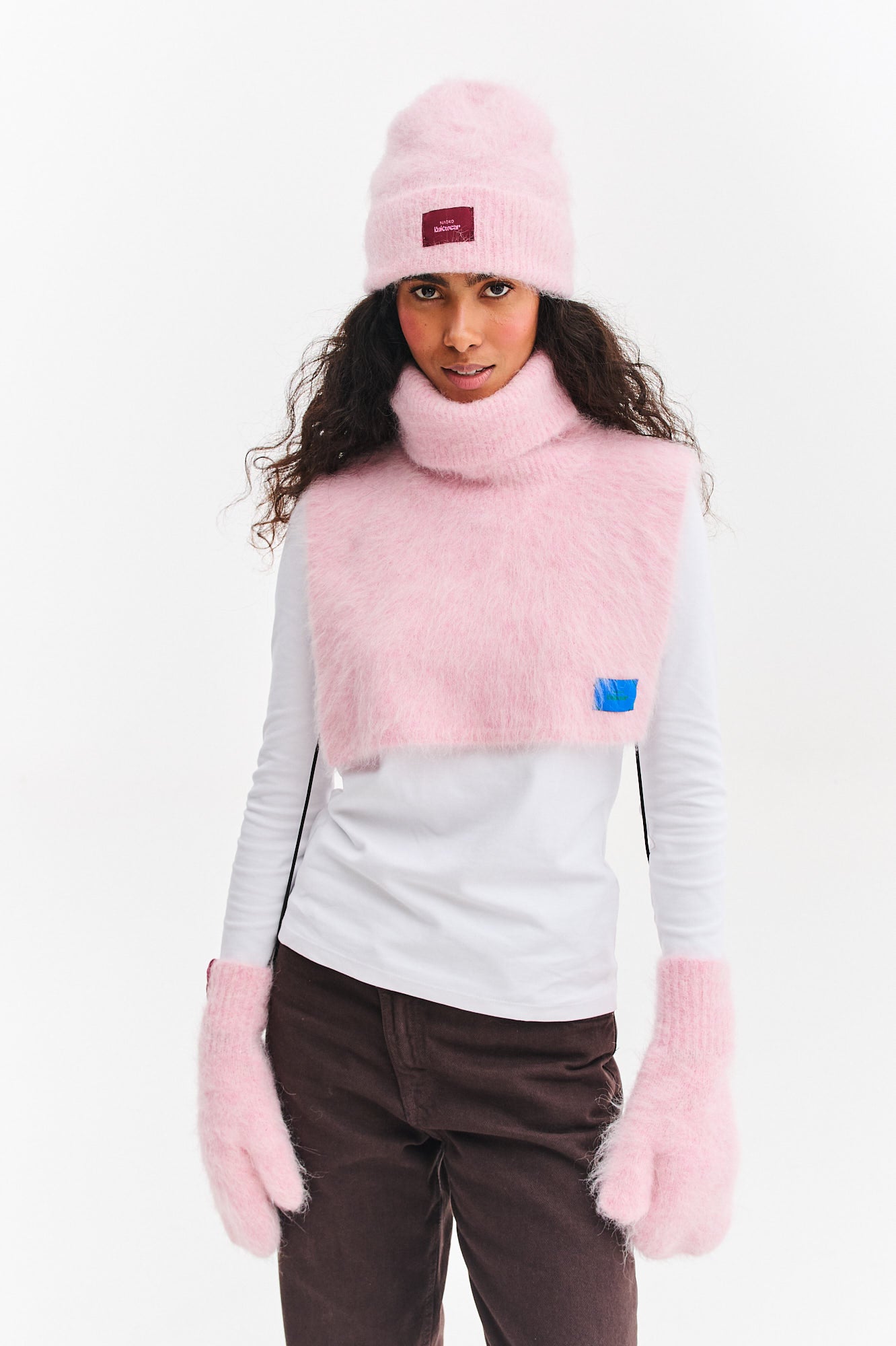 Puszysta i ciepła dzianina z dodatkiem wełny z alpaki jest niezwykle miła w dotyku i nie podrażnia delikatnej skóry szyi. Subtelny, różowy kolor "Blush" doda Twoim stylizacjom lekkości. Stwórz idealnie dopasowany komplet, łącząc go z czapką Huggy Blush.