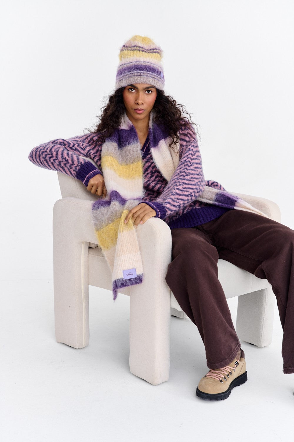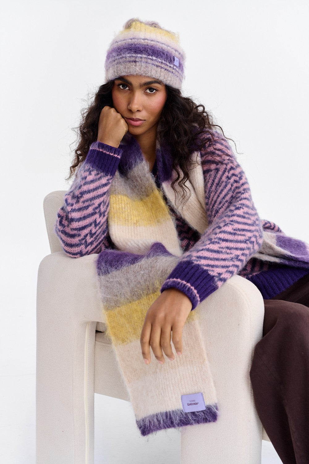 Szerokie, nieregularne pasy w stonowanych odcieniach, przełamanych żółtym kolorem, tworzą radosną, artystyczną kompozycję. Ten szalik to mocny akcent, który odmieni każdą, nawet najprostszą stylizację i doda Ci energii w chłodne dni.