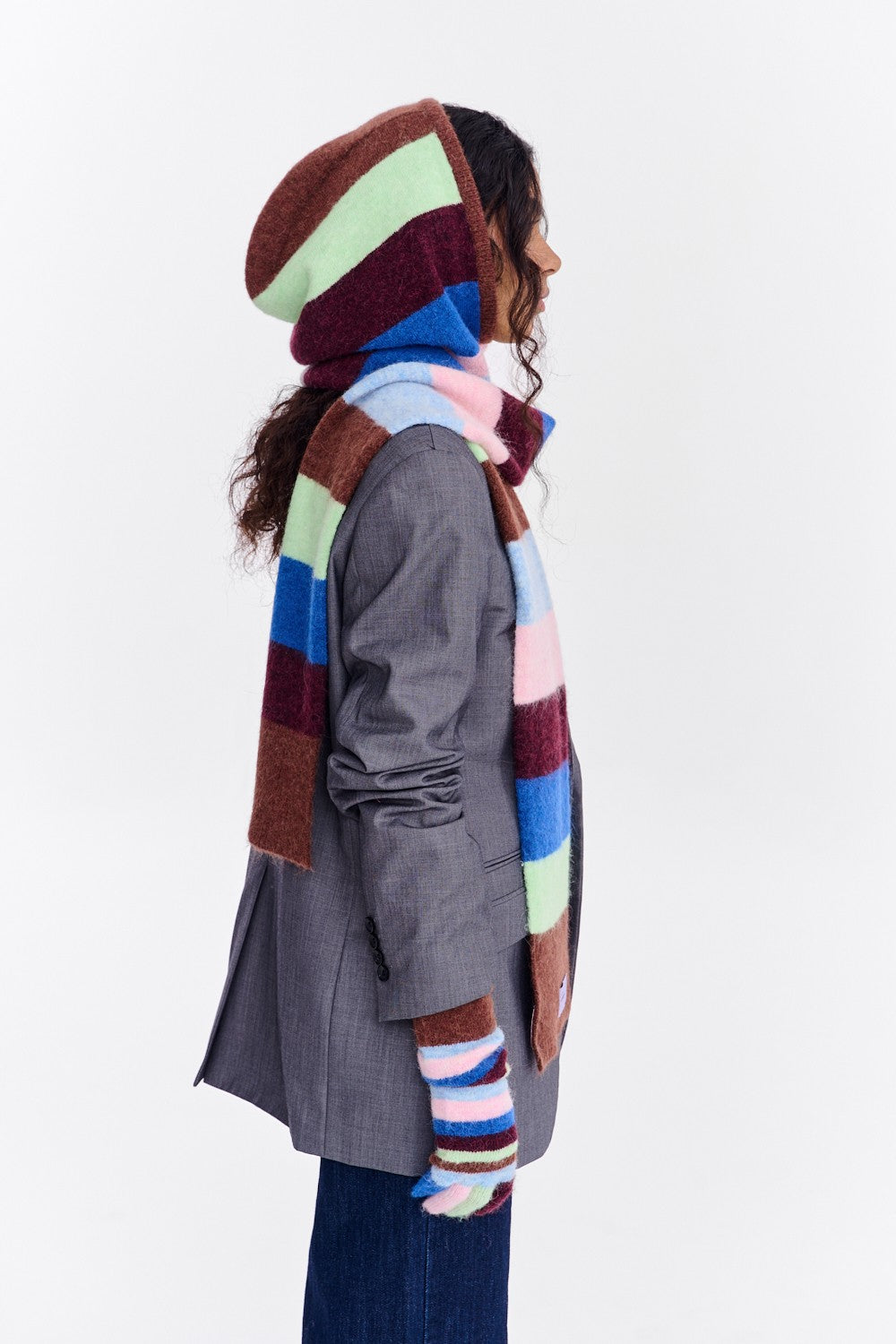Dzięki jego nieoczywistej formie, możesz go nosić na wiele sposobów – klasycznie owinięty wokół szyi, luźno puszczony wzdłuż płaszcza lub w roli chustkę na głowę. Stwórz komplet z pasującymi rękawiczkami i kominiarką z tej samej serii, aby uzyskać totalnie odjechany, kolorowy look.
