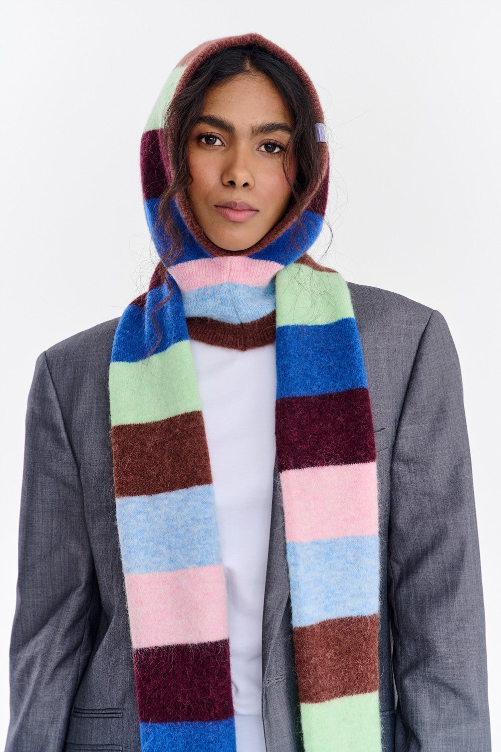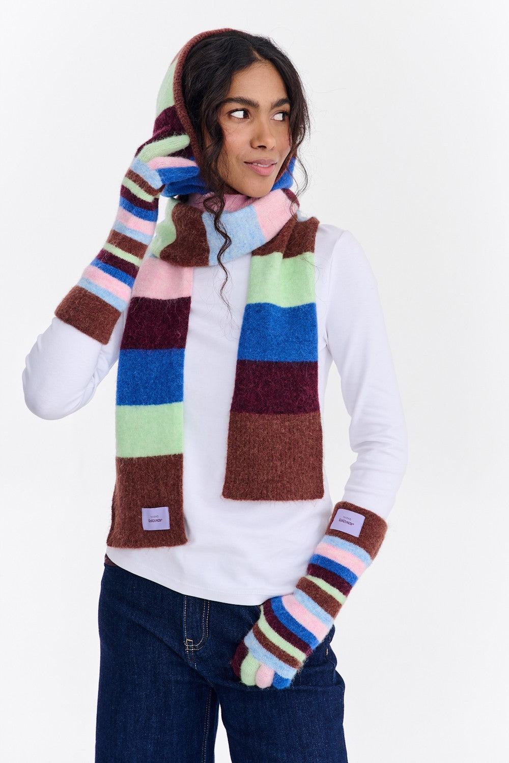 Szalik Mood Changer to koloroterapia w czystej postaci. Ten ciepły szalik w paski to idealny dodatek, by przełamać monotonię każdej stylizacji. Zestawienie nieoczywistych kolorów, takich jak brąz, limonka, błękit i róż, tworzy dynamiczną i radosną kompozycję.