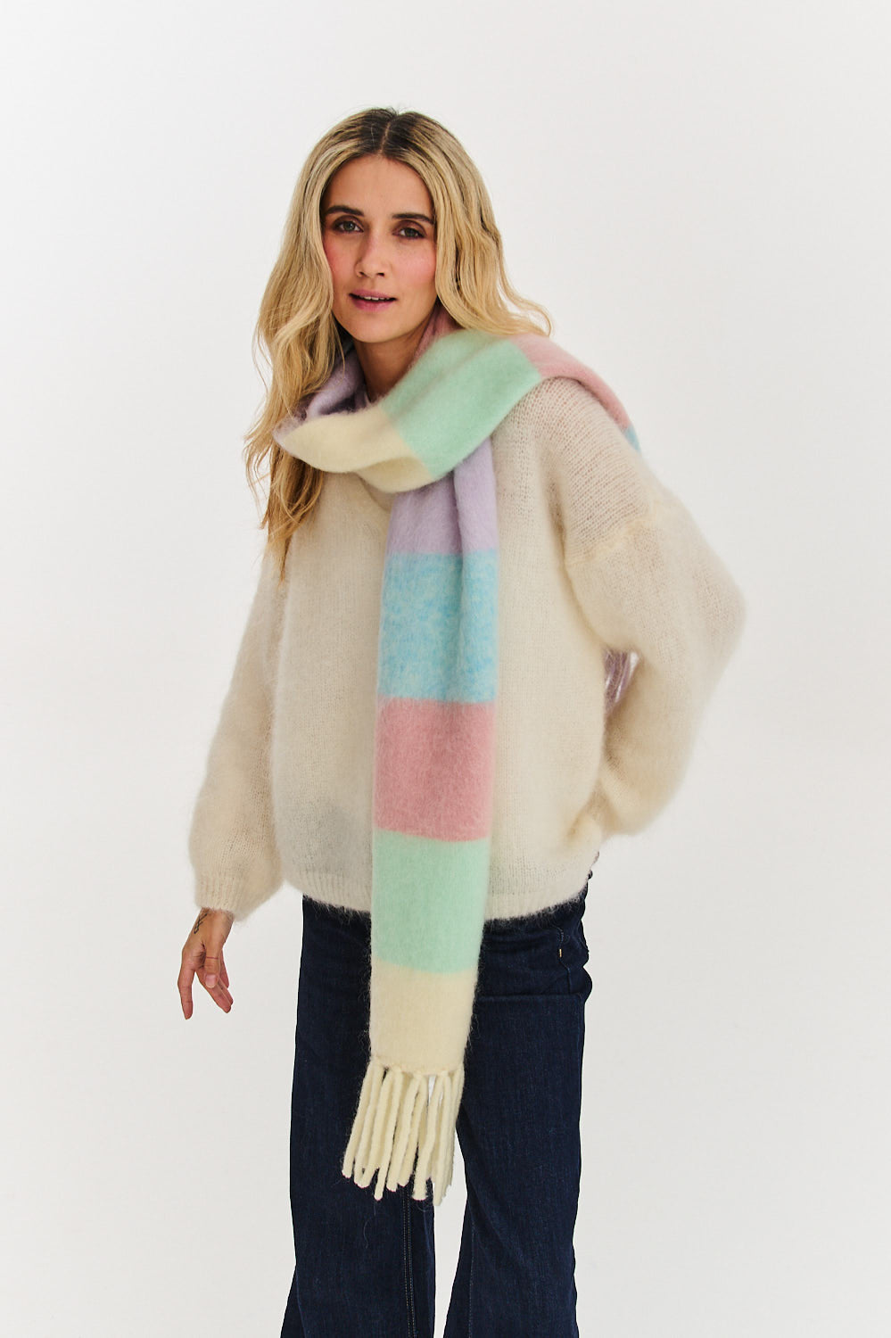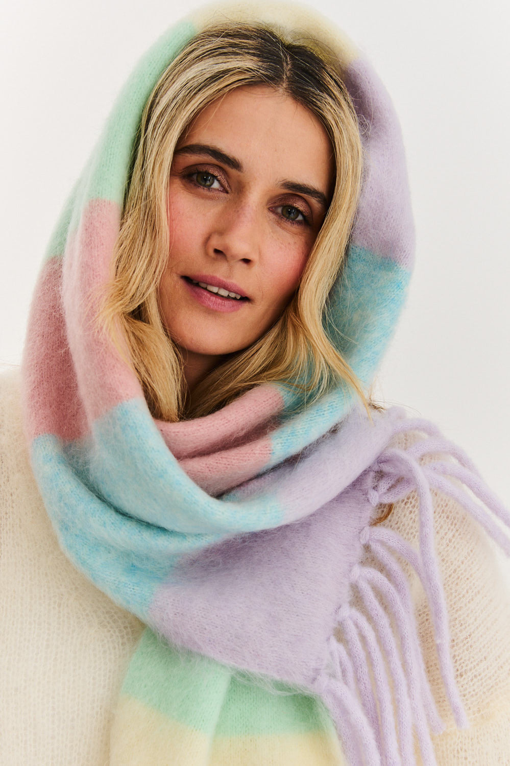 Szeroki szalik Candy Gelato w pastelowych kolorach. Jego puszysta faktura jest niezwykle przyjemna dla skóry, a krój pozwala na różnorodne sposoby noszenia – luźno zarzucony na ramiona lub ciasno owinięty wokół szyi. To idealny dodatek, by rozjaśnić pochmurne dni.
