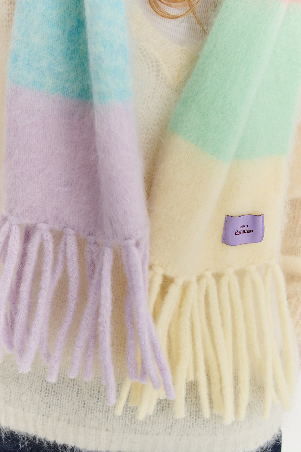 Szerokie pasy w kolorach lodów owocowych – różowym, pistacjowym, cytrynowym i błękitnym – przełamane są neutralną szarością, co nadaje mu wyważonego charakteru. Klasyczne frędzle na końcach dodają mu nonszalancji. Będzie pięknie wyglądał w zestawie z jasnym płaszczem.