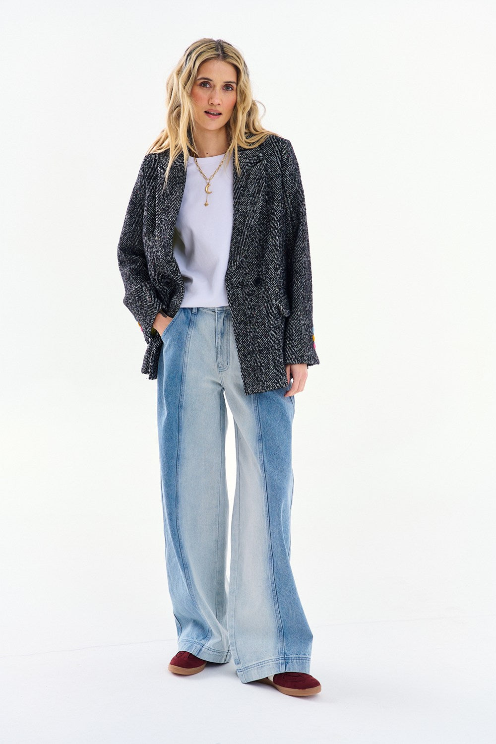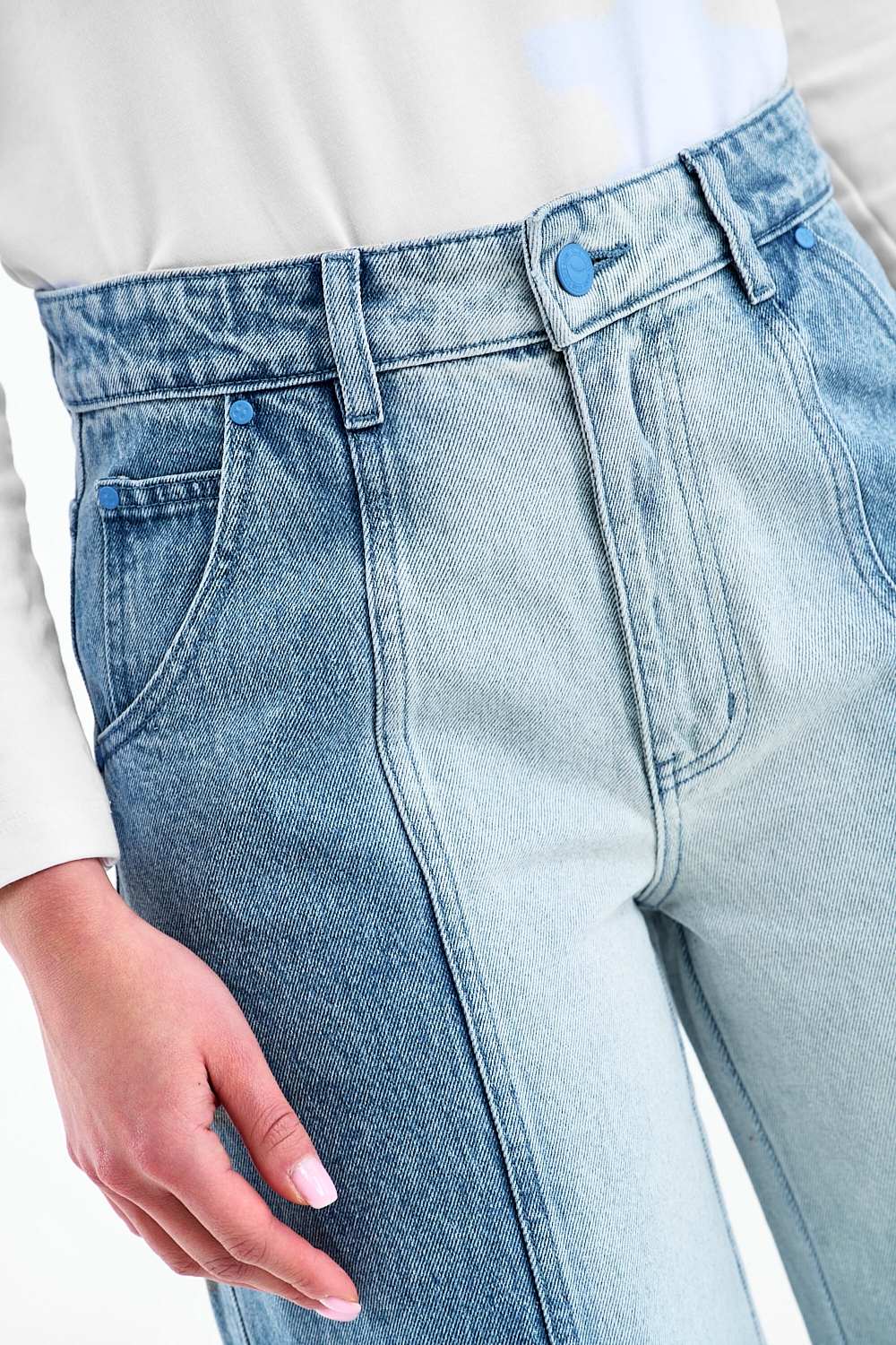 Szerokie spodnie jeansowe Secret Shine to ukłon w stronę mody vintage i upcyclingu. Charakterystyczne połączenie dwóch odcieni denimu w pionowych panelach tworzy niepowtarzalny design, który modeluje sylwetkę. Wysoki stan i szeroka nogawka zapewniają wygodę i najmodniejszy look sezonu.