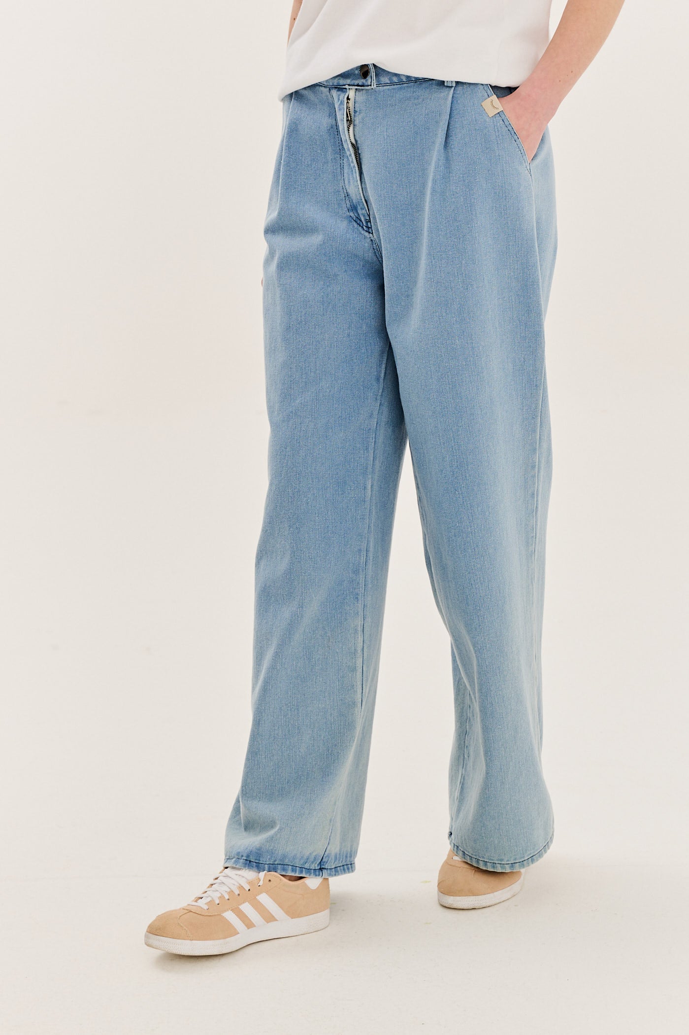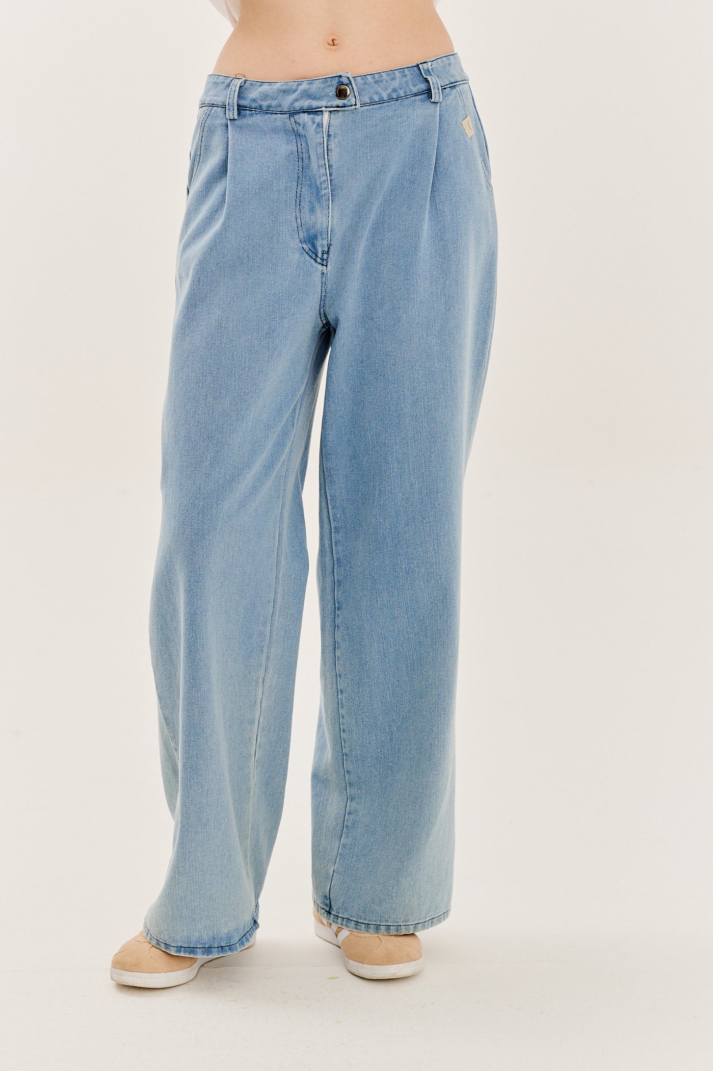Szerokie spodnie jeansowe Timeless to kwintesencja swobody i stylu. Ich luźny krój jest nie tylko wygodny, ale także niezwykle modny, dodając ponadczasowego charakteru każdej stylizacji. Delikatny odcień jeansu rozświetla każdą stylizację, nadając jej lekkości i świeżości.