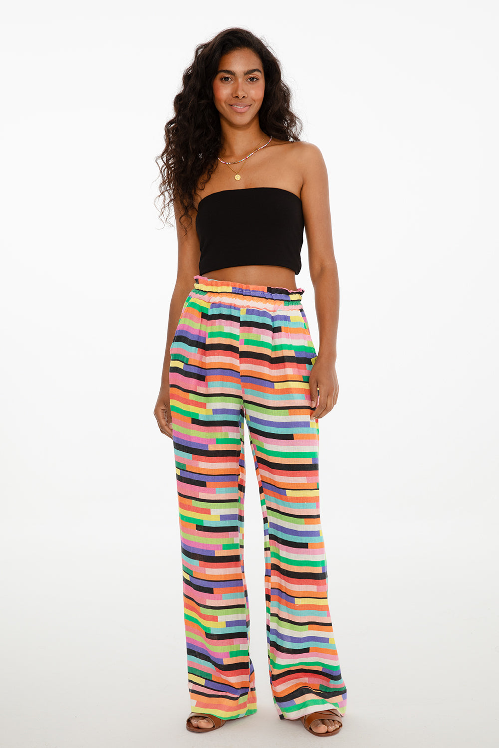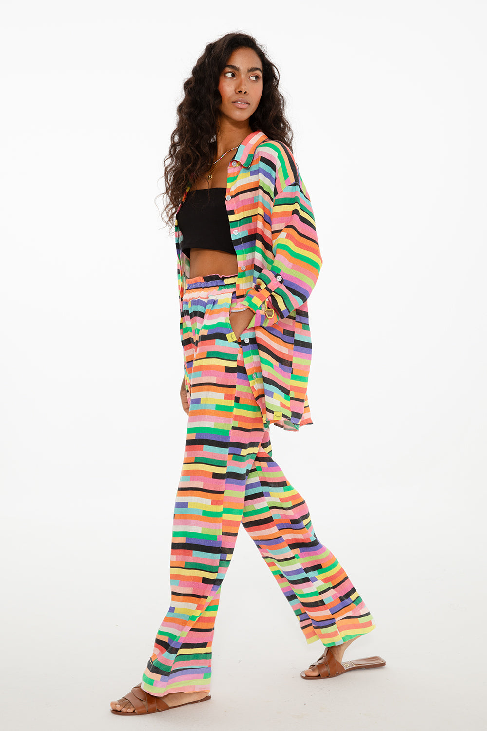 Jeśli wakacje miałyby swój kod graficzny, wyglądałby właśnie tak! Kolorowe, rytmiczne pasy w szerokich spodniach lnianych Tropical Trance to czysta energia lata zamknięta w lekkim, oddychającym lnie. Szeroka nogawka i elastyczny pas w talii zapewniają maksymalny komfort i swobodę ruchu – idealne do spacerów po promenadzie, tańców pod palmami i leniwych poranków z kawą na tarasie.