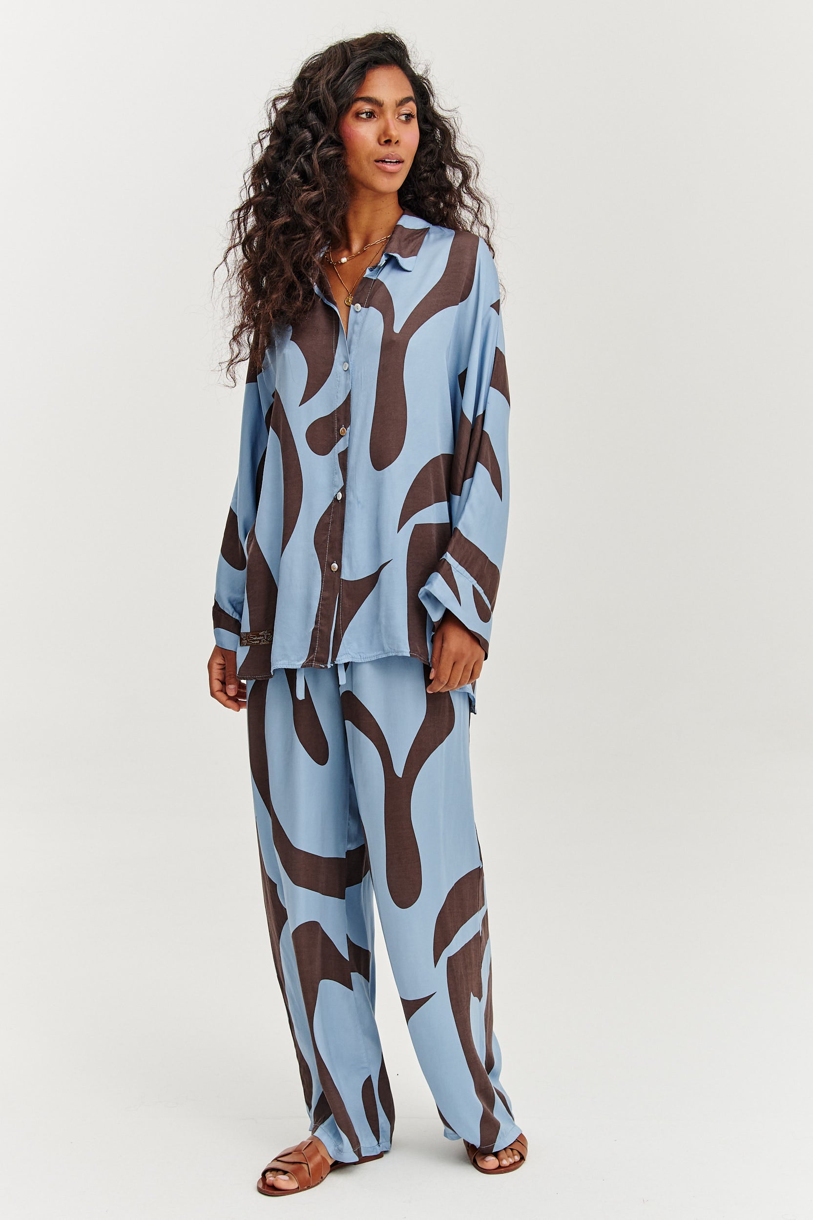 Szerokie spodnie Wave Whisperer to wyjątkowe połączenie swobody i artystycznego wyrazu. Uszyte z lekkiego, przyjemnego w dotyku materiału w błękitno-czekoladowy wzór przypominający fale, od razu przyciągają spojrzenie. Luźny krój i wysoki stan gwarantują maksymalny komfort, a jednocześnie wydłużają sylwetkę.