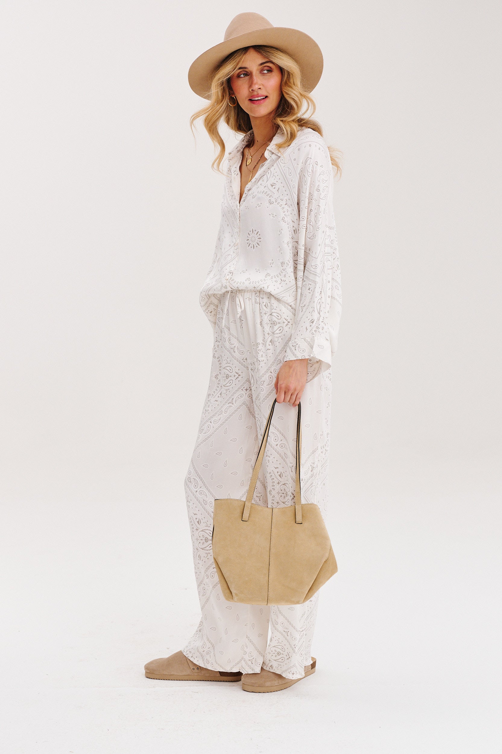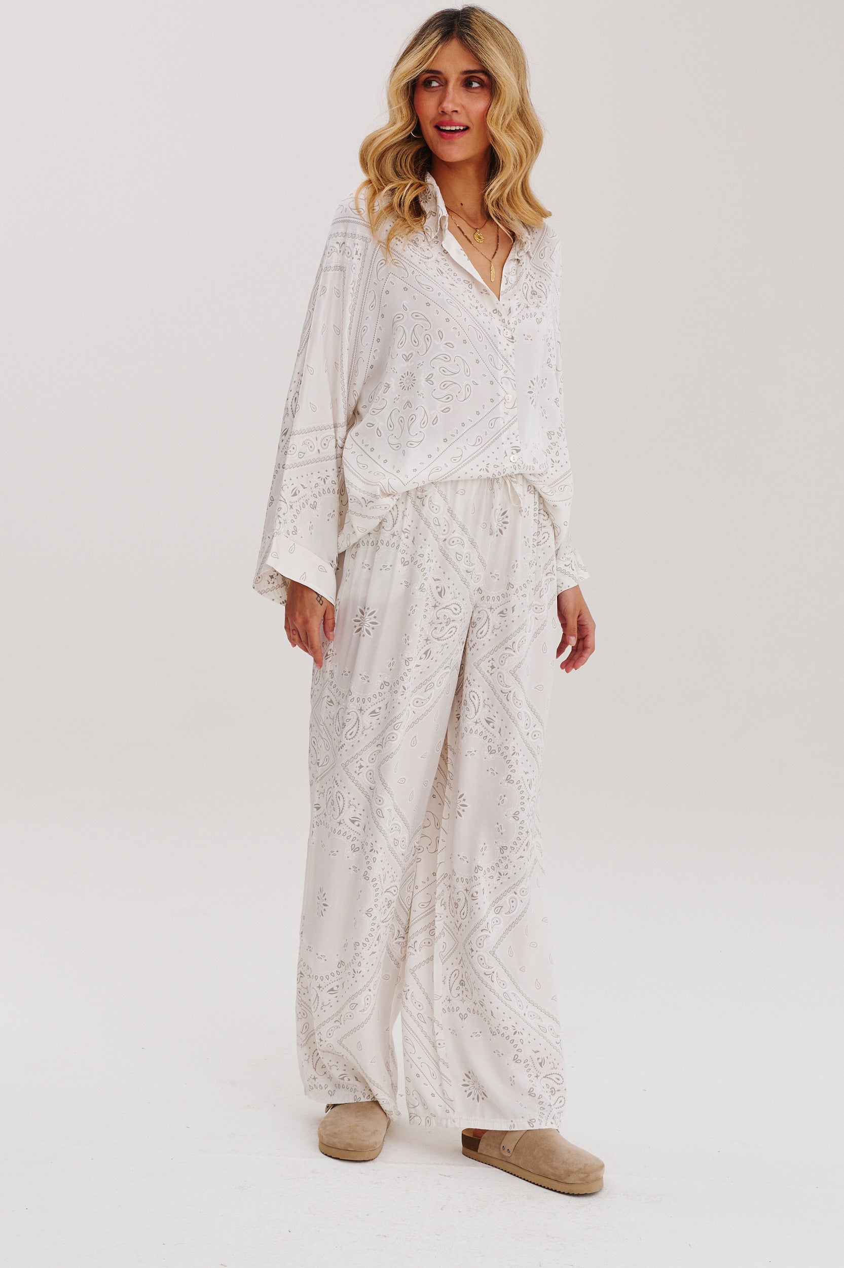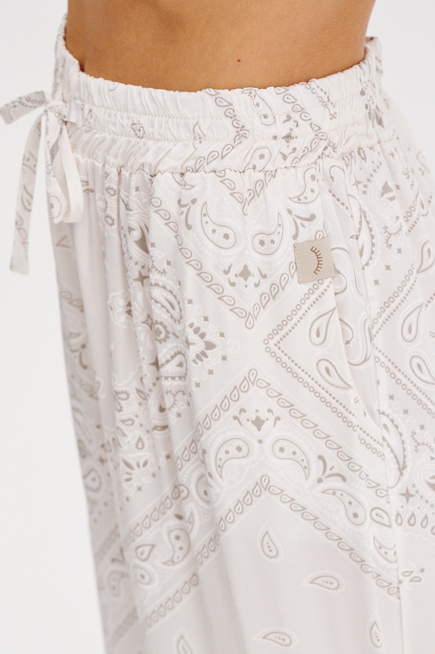 Szerokie spodnie Wildflower Soul to esencja delikatności i swobody. Ich kremowa tkanina wiskozowa subtelnie połyskuje, tworząc idealne tło dla eterycznego wzoru bandany, który przywodzi na myśl ciepłe promienie słońca i kwietne łąki o poranku.