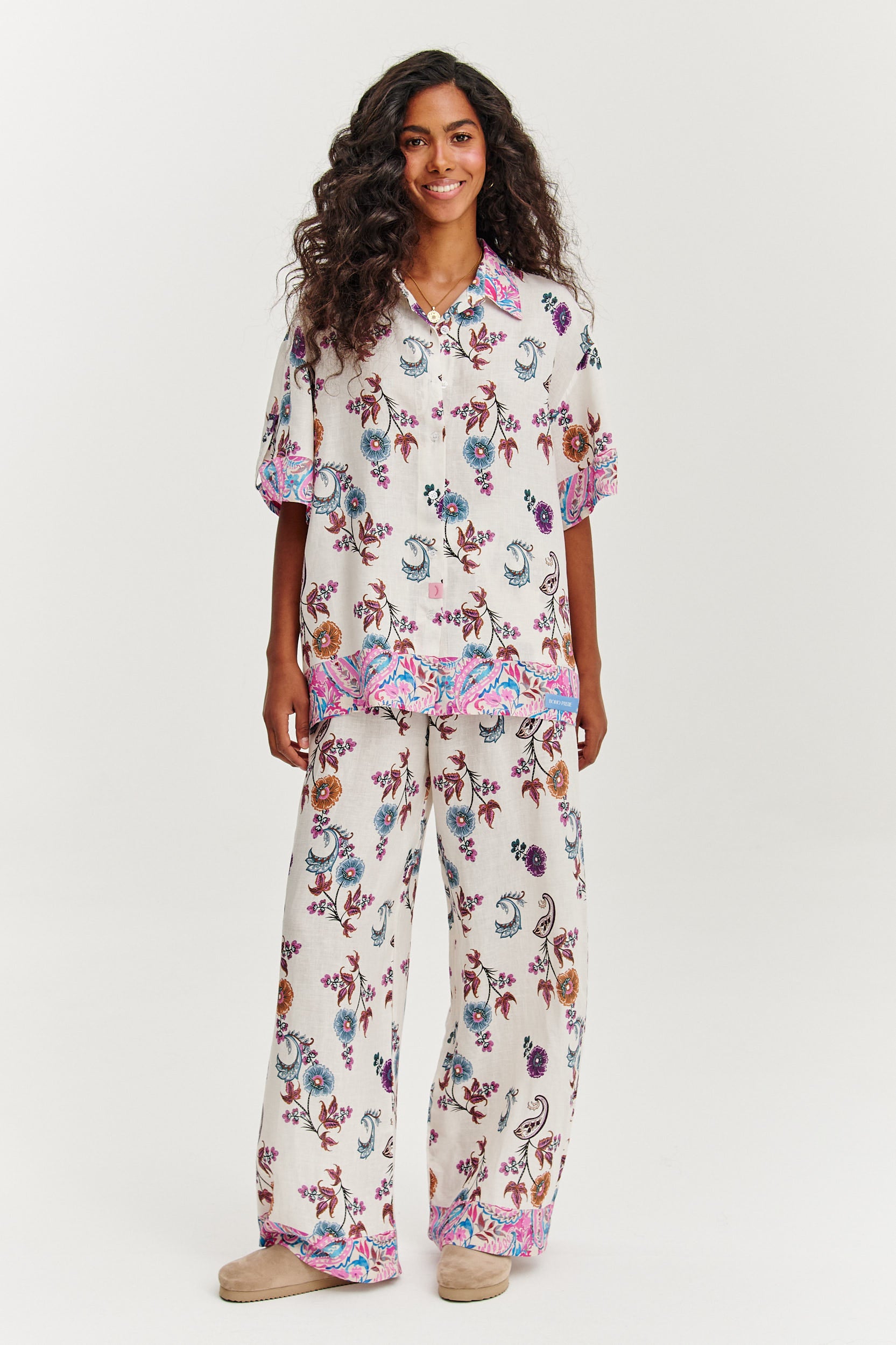 Jeśli marzysz o stylizacji, która wyróżnia się w tłumie, szerokie spodnie z lnem Desert Blossom są dokładnie tym, czego potrzebujesz. Ich przyciągający wzrok print to eksplozja koloru – różu, błękitu i fioletu – która przenosi w klimat beztroskich festiwali i letnich podróży.