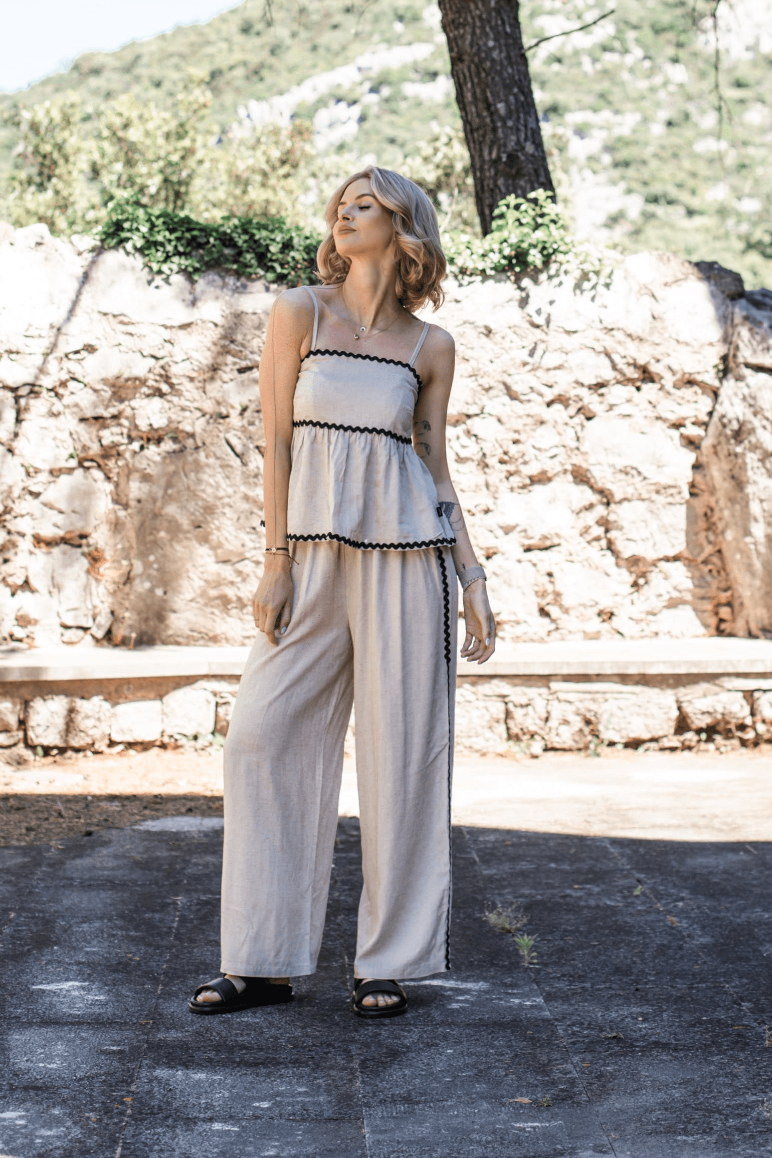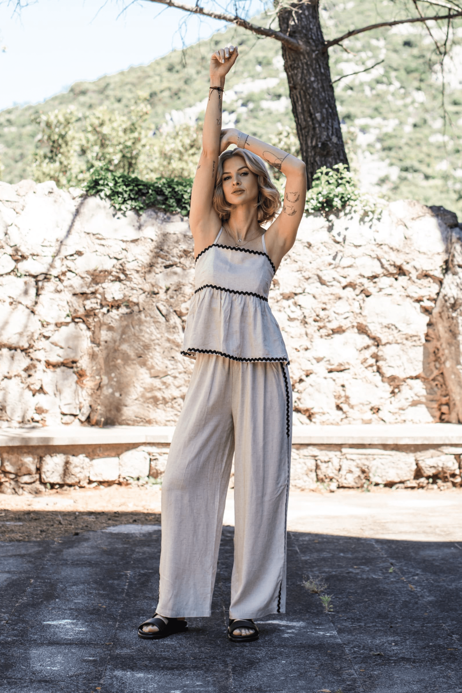 Letni komfort w najlepszym wydaniu – szerokie spodnie Sandy Toes to połączenie przewiewnego lnu, wygodnego fasonu i subtelnych detali. Szerokie nogawki nadają im lekkości, a dekoracyjna czarna fala biegnąca wzdłuż nogawek dodaje charakteru.