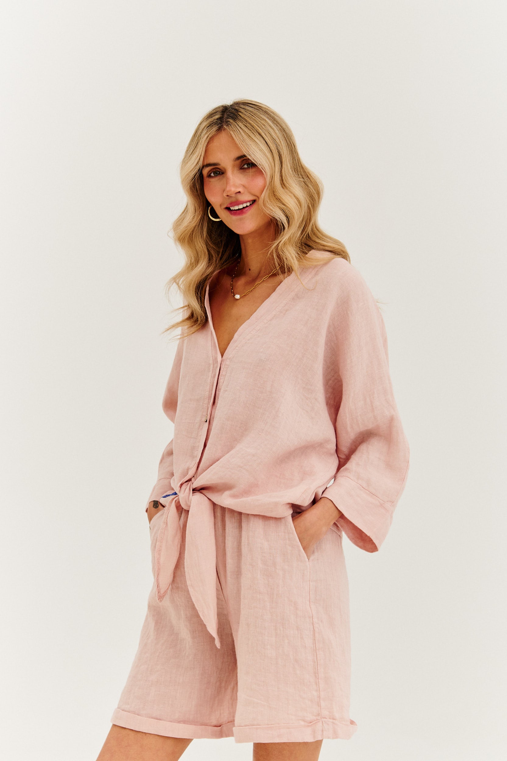 Wykonane z oddychającego lnu w odcieniu pudrowego różu, idealnie sprawdzą się na spacer po plaży, śniadanie w ogrodzie czy letnie city breaki. Zestaw je z marynarką z tej samej kolekcji lub kolorową bluzą – i poczuj lekkość morskiego powietrza, nawet w środku miasta.