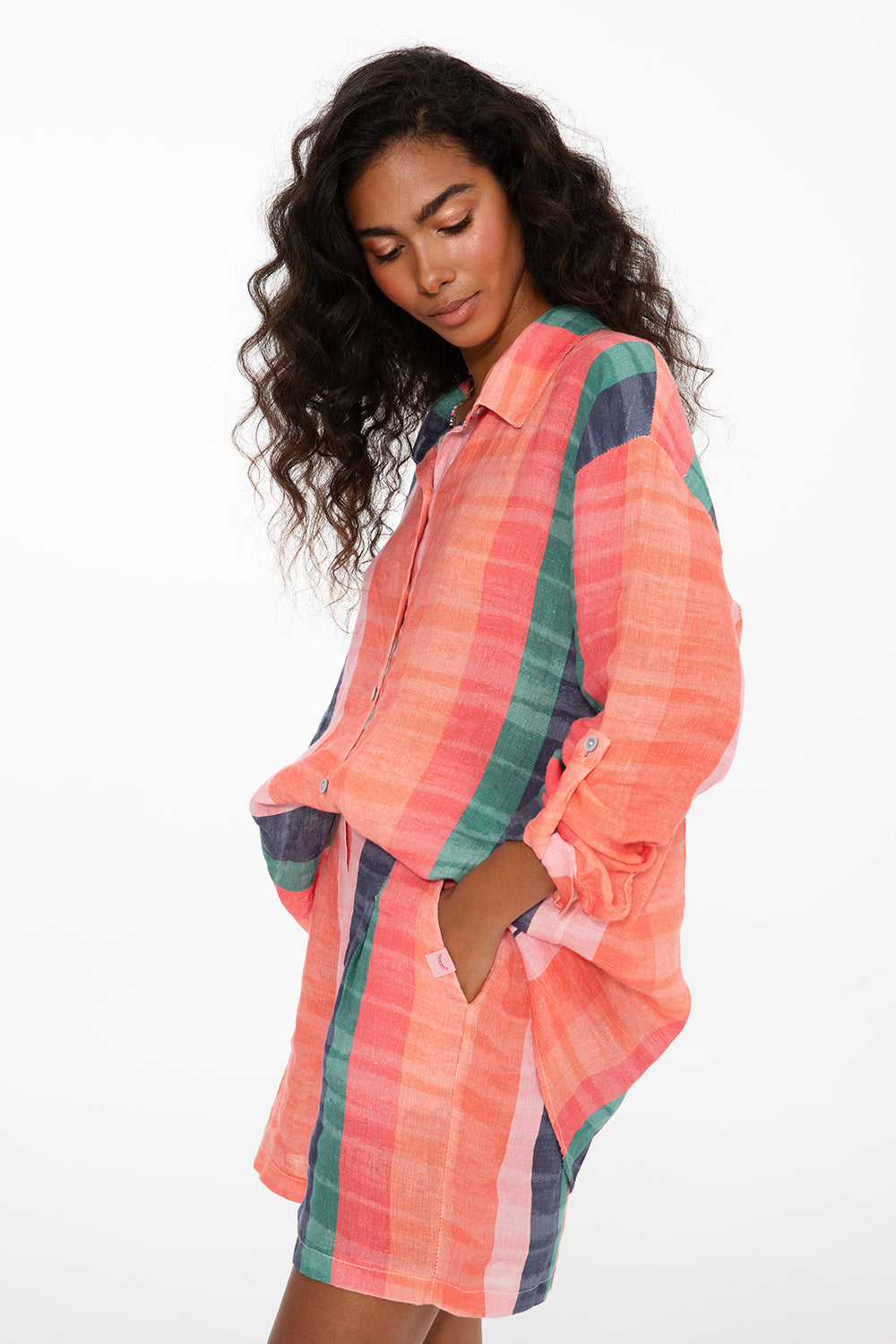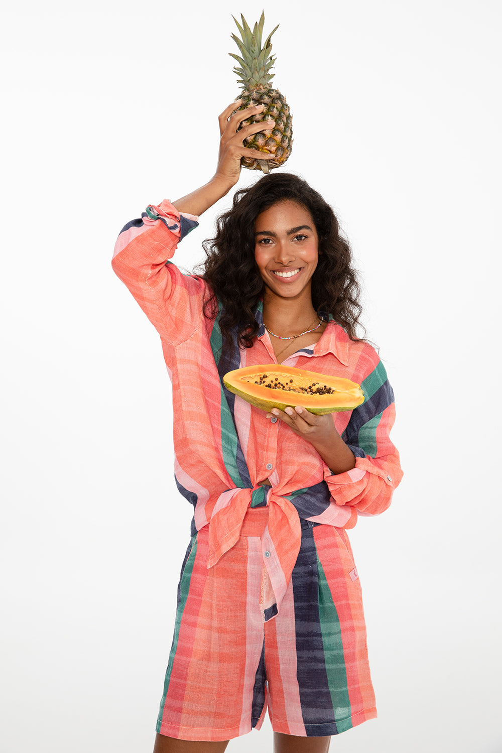 Szorty lniane Paradise Code to kolorowy manifest wakacyjnego optymizmu. Uszyte z przewiewnej mieszanki lnu i wiskozy, urzekają wielobarwnymi pasami i uroczym paskiem z tego samego materiału, który pięknie podkreśla talię.