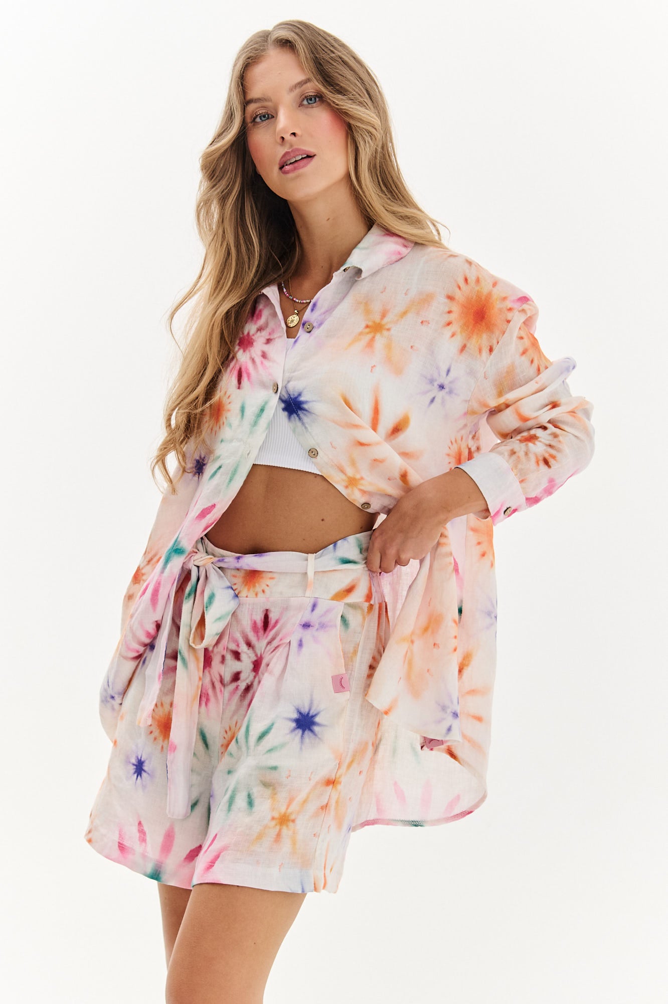 Dzięki barwnemu printowi w stylu tie-dye i przewiewnej lnianej tkaninie, te szorty sprawdzą się w każdy upalny dzień. Mają luźny krój, elastyczny pas z tyłu i wiązanie z przodu, które podkreśla talię i dodaje uroku. Noś je z prostym topem, koszulą oversize lub bikini – zawsze wyglądają świetnie!