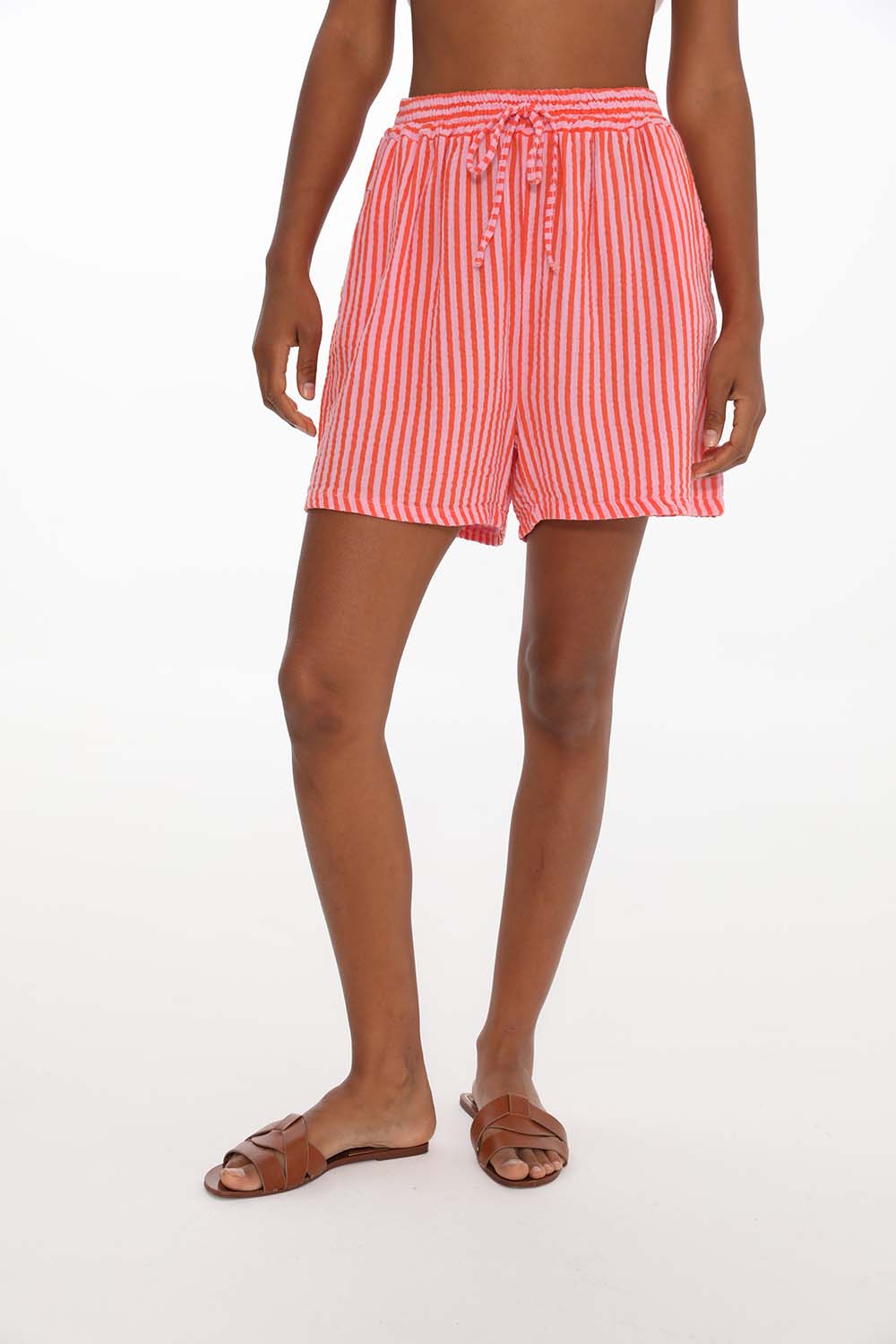 Szorty muślinowe Cherry Sunset to idealna propozycja na słoneczne dni – uszyte z przewiewnej bawełny, zachwycają wygodą i dziewczęcym urokiem. Klasyczny fason z elastyczną talią zapewnia swobodę ruchów, a różowo-czerwony print w kratkę wprowadza wakacyjny klimat rodem z włoskich plaż.