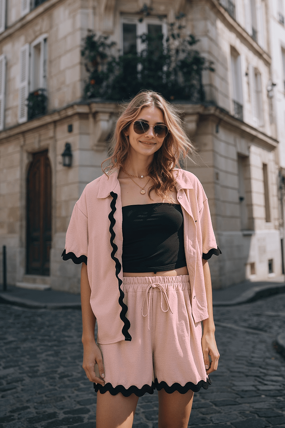 Szorty Rosewater Crush to lekki, swobodny model idealny na letnie dni. Uszyte z naturalnej tkaniny w kolorze pudrowym, wyróżniają się elastyczną talią ze sznurkiem oraz ozdobną czarną taśmą przy nogawkach, która dodaje charakteru. Krój zapewnia komfort i swobodę ruchów, sprawiając, że szorty doskonale układają się na sylwetce.