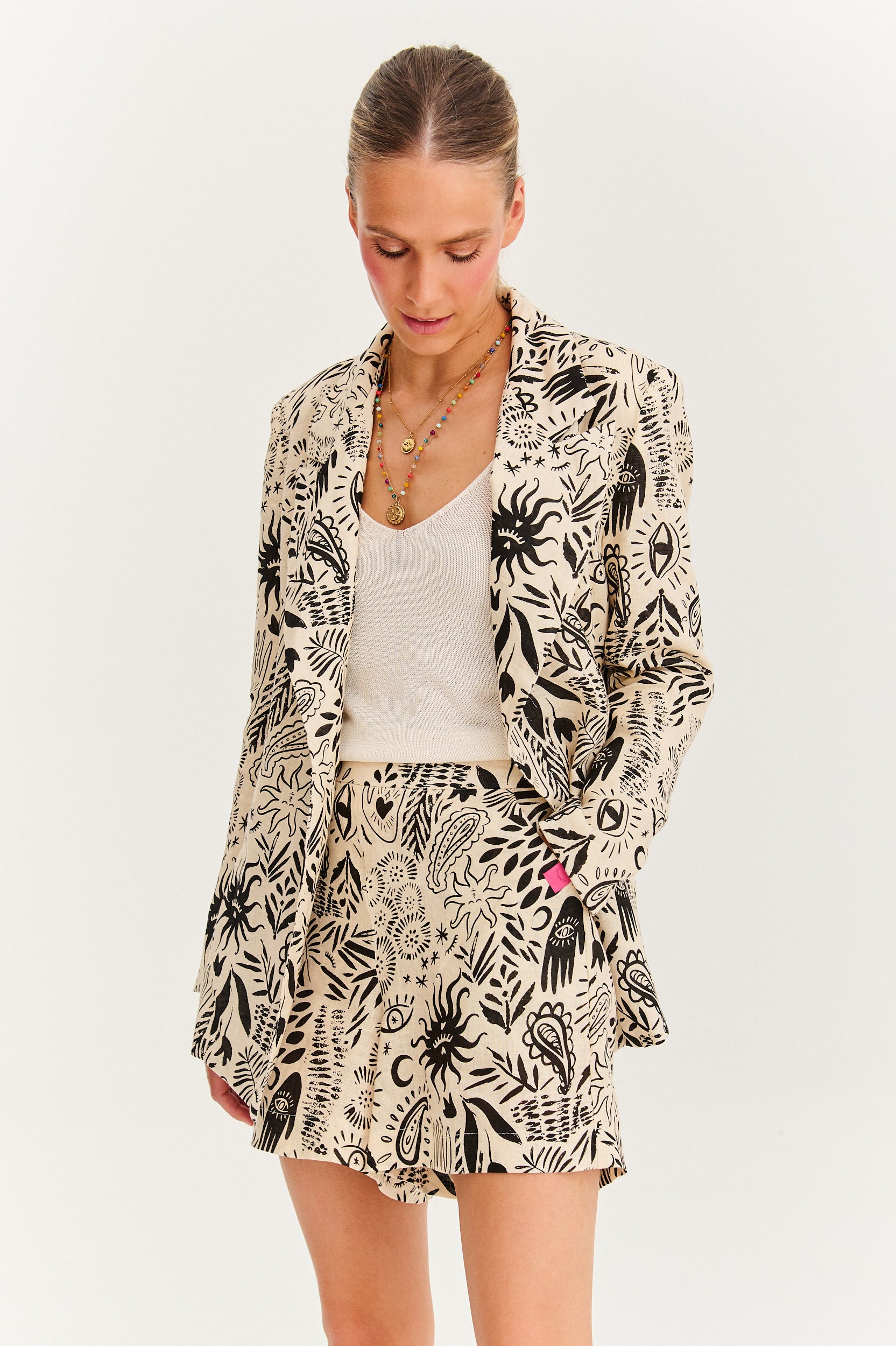 Szorty z lnem Fresco of Desire to letnia wariacja na temat sztuki noszenia emocji. Ich unikalny nadruk przypomina współczesny fresk pełen symboli, które odkrywasz z każdą chwilą.