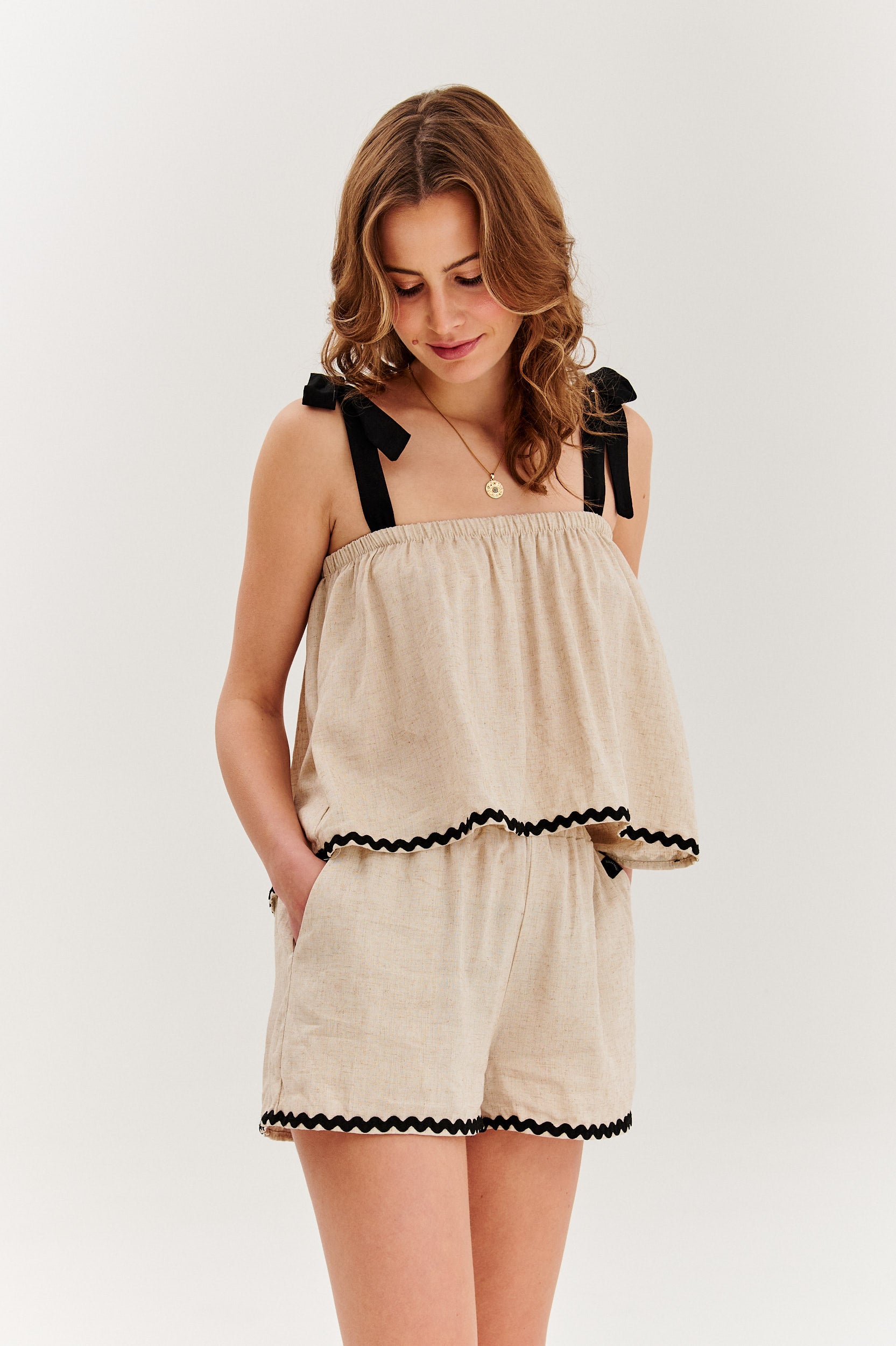 Szorty z lnem Soft Lines to lekki, swobodny model idealny na letnie dni. Uszyte z naturalnej tkaniny w kolorze beżowym, wyróżniają się elastyczną talią ze sznurkiem oraz ozdobną czarną taśmą przy nogawkach, która dodaje charakteru. Krój zapewnia komfort i swobodę ruchów, sprawiając, że szorty doskonale układają się na sylwetce.